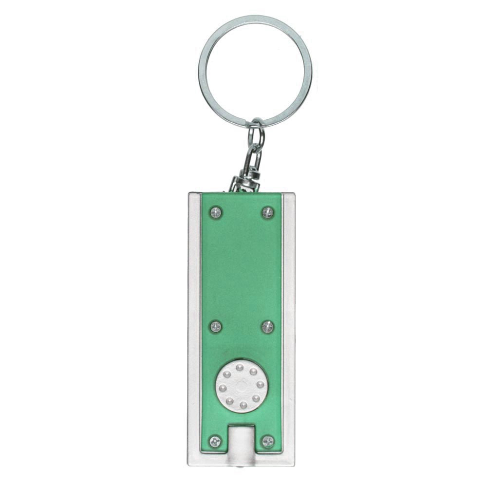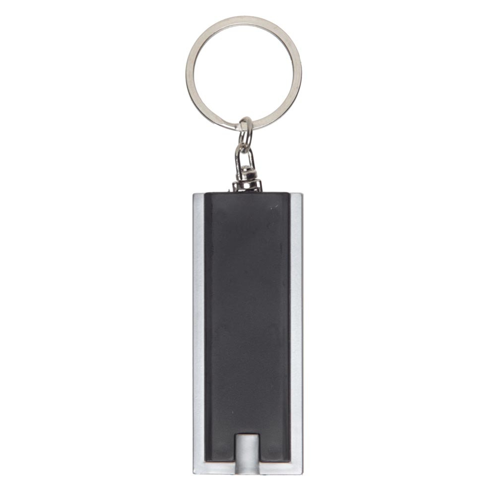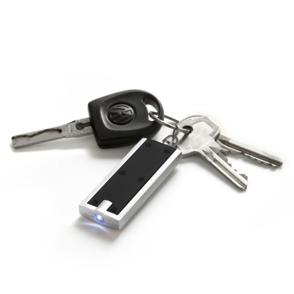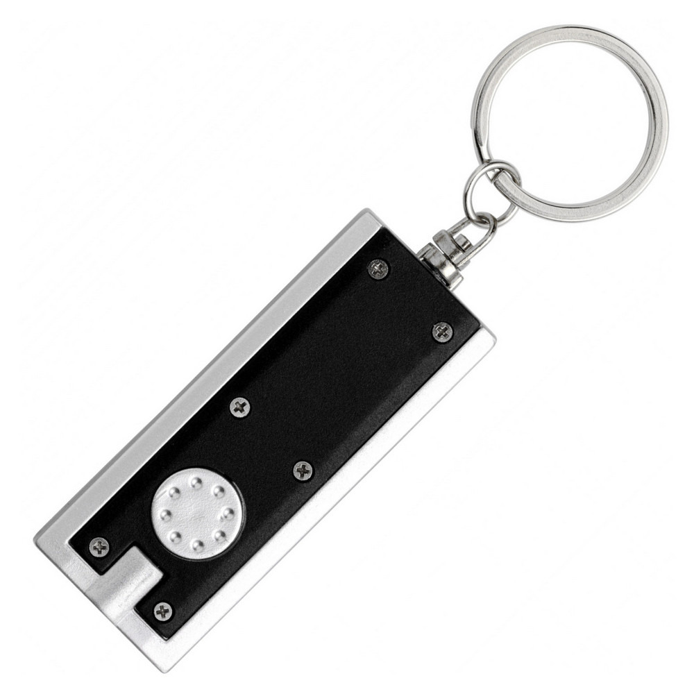 LED keychain flashlight with a button. Plastic case. The ring on the chain allows you to use the product as a key chain.