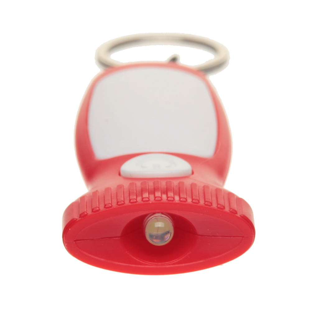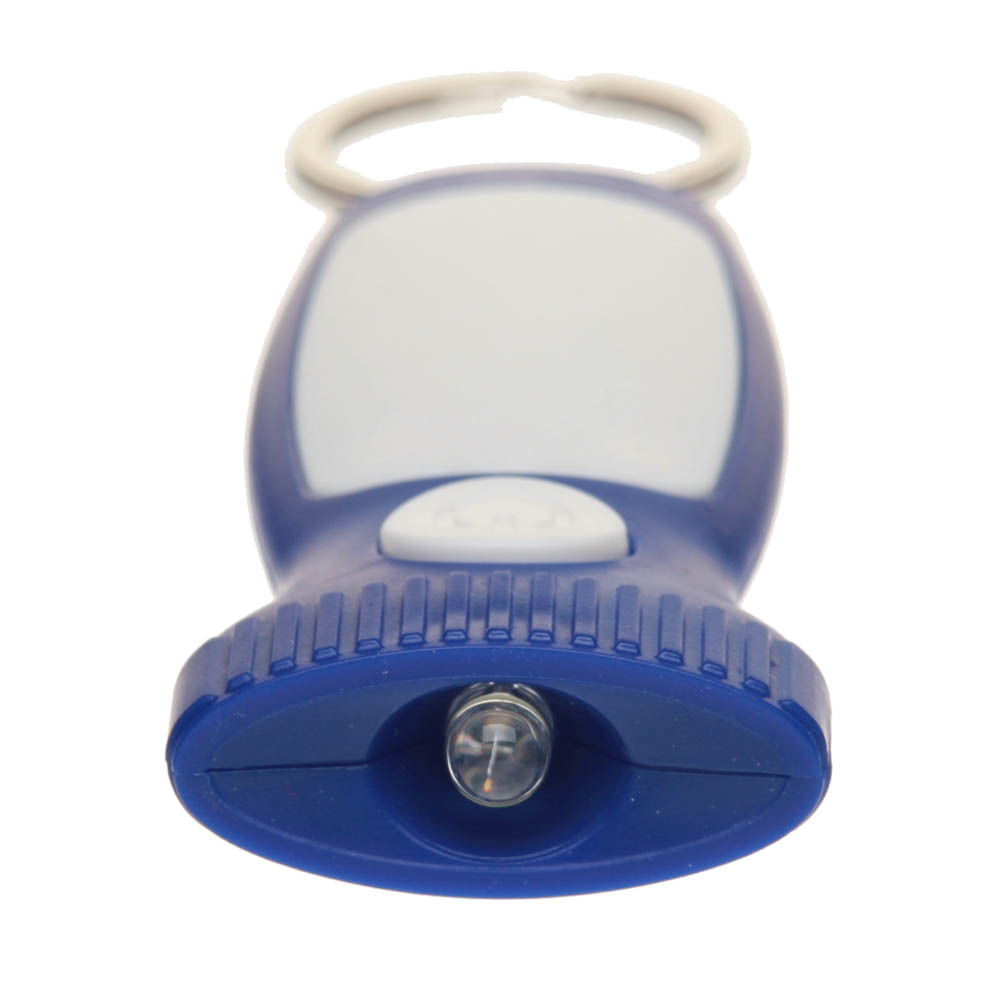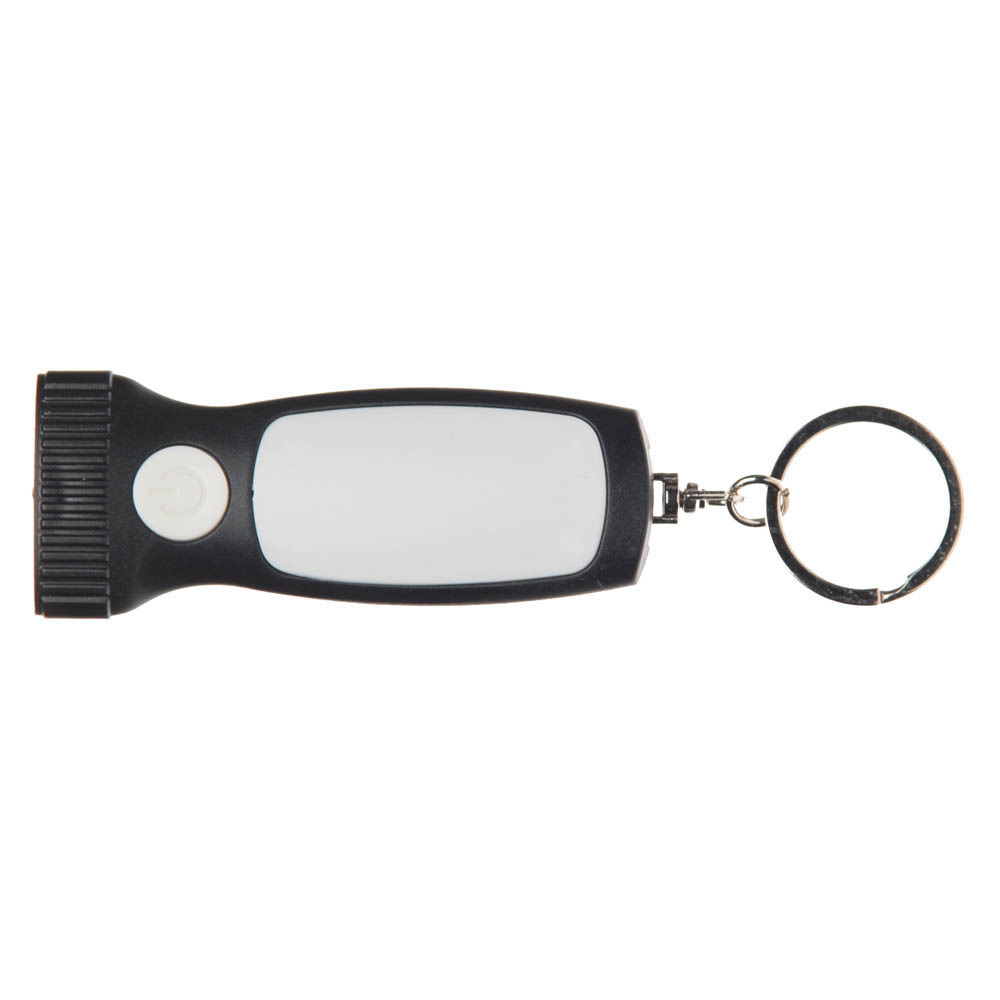Plastic keychain flashlight with white LED. The flashlight is powered by 3 button batteries (included in the kit). The logo is applied to the body of the product.