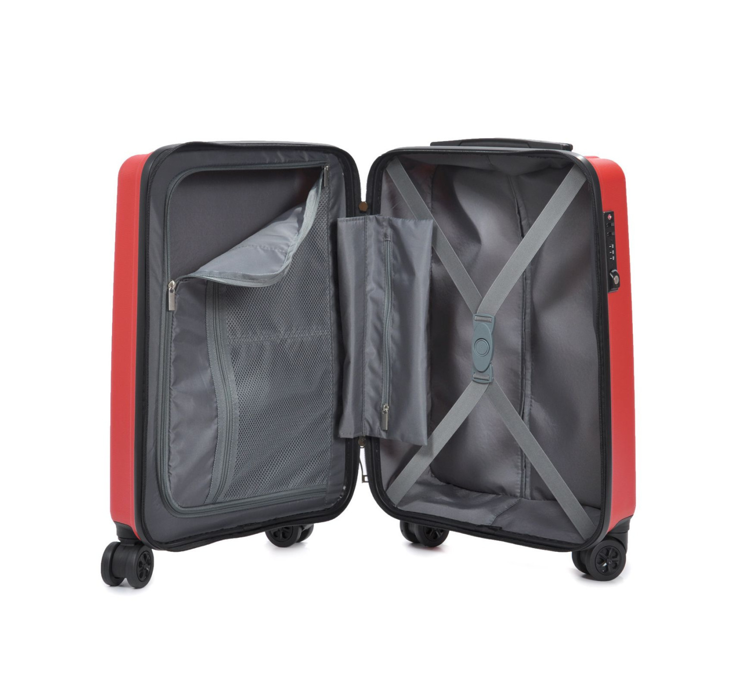 Ultra-light and strong suitcase on 8 (4x2) wheels. It is equipped with a code lock of the TSA system, a telescopic aluminum handle with latches. The interior is lined with fabric, has 2 compartments separated by a diaphragm and a zippered pocket for small items; elastic straps for fixing things.