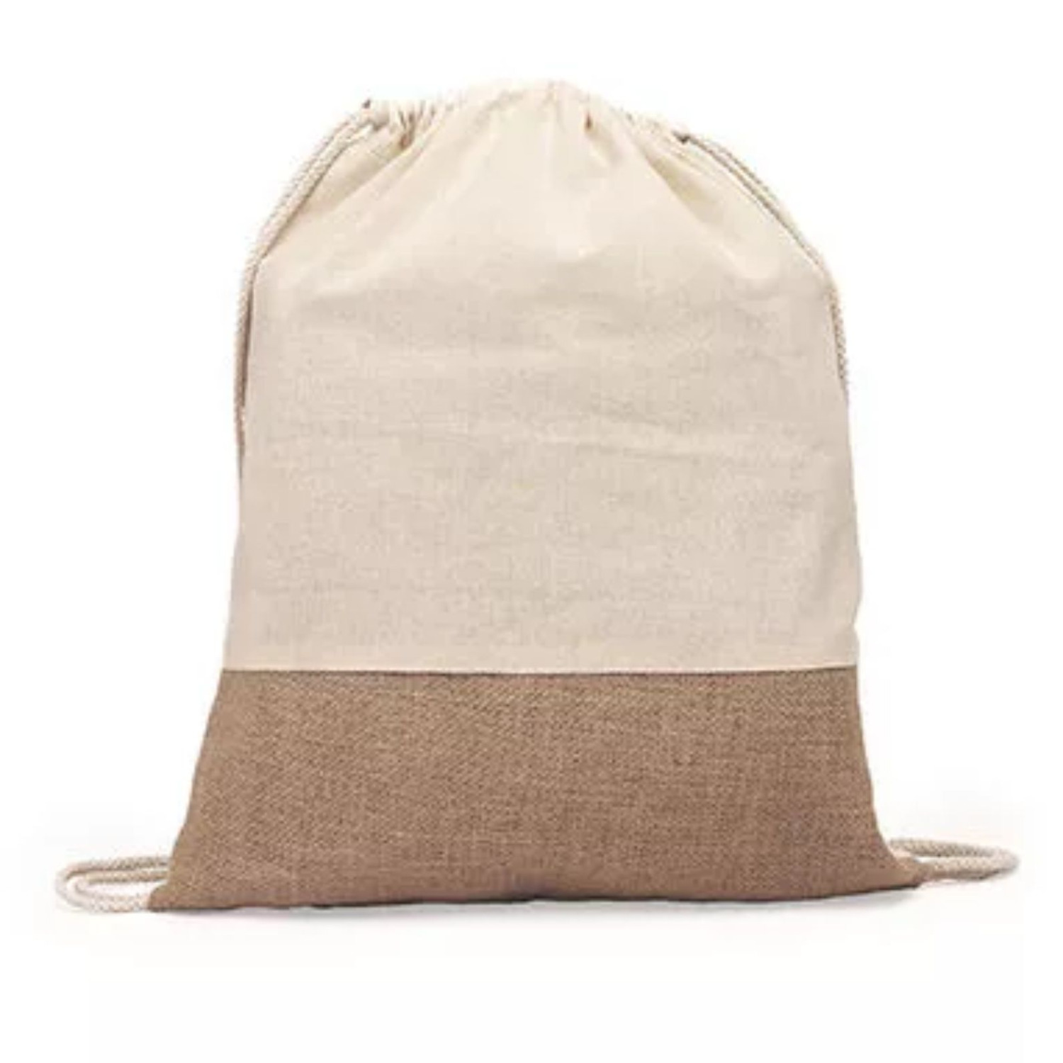 Eco backpack with ropes made of 120 g/m² cotton and jute. Natural color. Jute stripe on the bottom of the front. Ropes are sewn to both bottom corners.