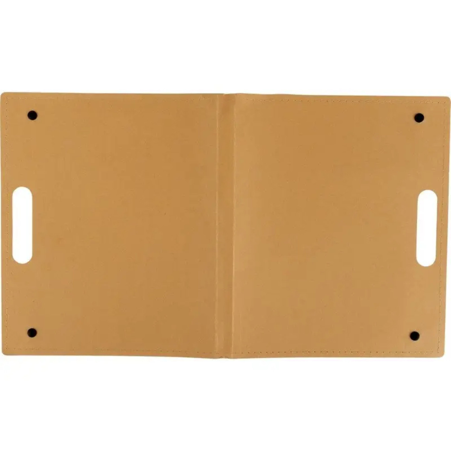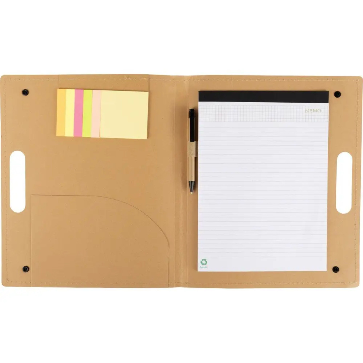 Folder for conferences A4 format from bio-cardboard on buttons with a cut-out handle. 100 sheets of sticky note paper (4 colors, 25 each). Notepad (20 sheets) and pen