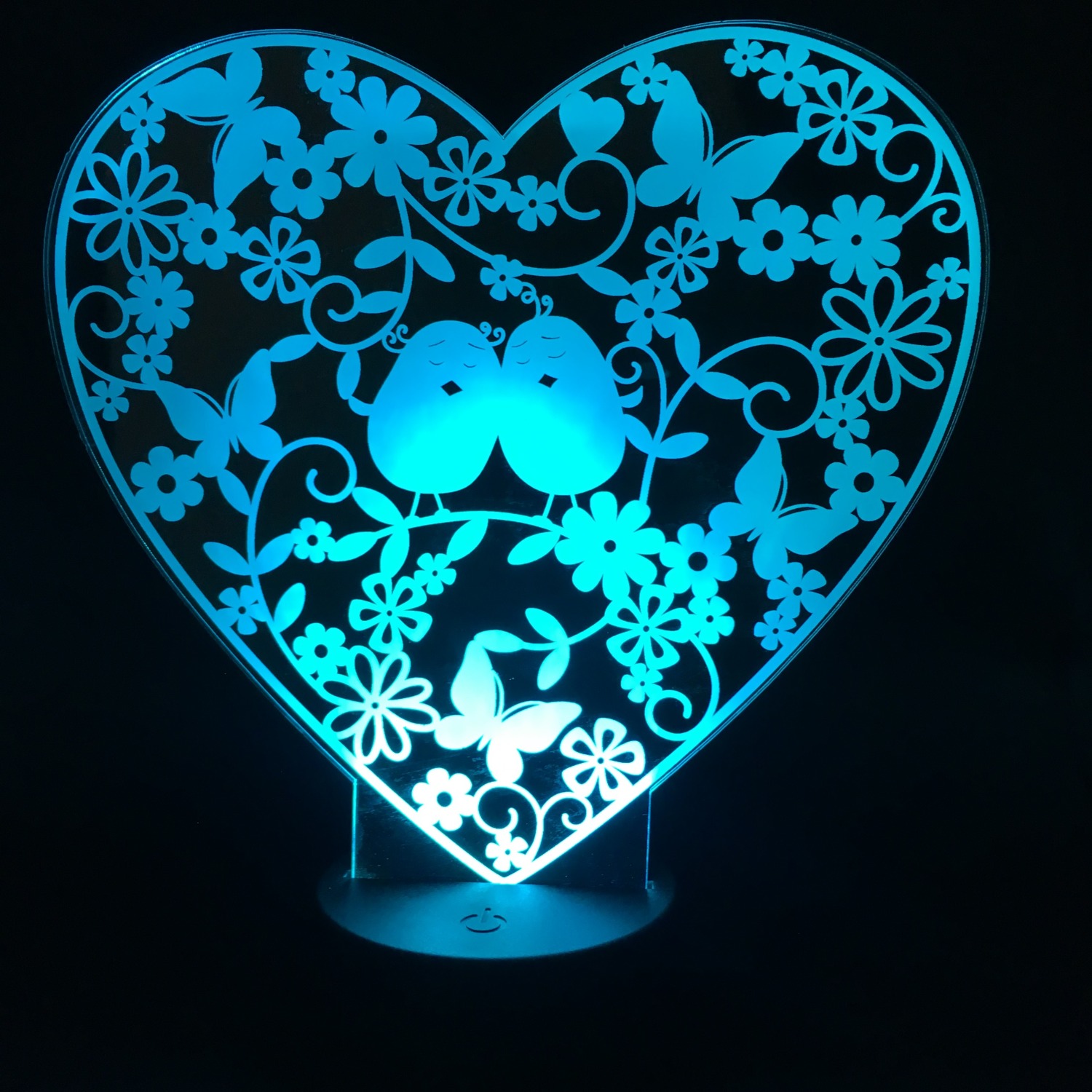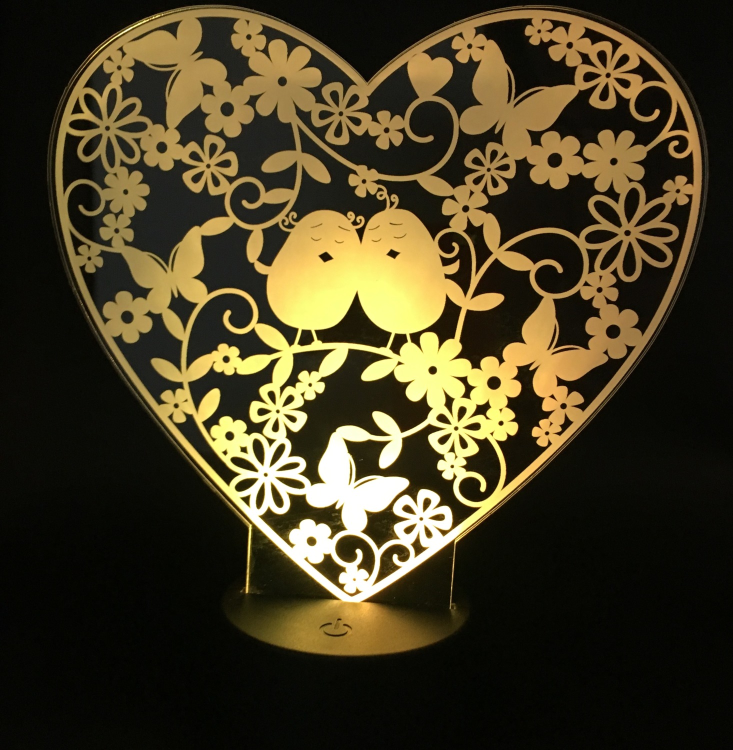 Lamp nightlight "Birds" It is made of acrylic 4 mm, the size of the visible part of the plate is 203 * 203 mm. Stand round shape with a diameter of 83 mm, height 40 mm. The power source is a battery or USB cable. Seven glow modes. The total height of the lamp 243 mm. The lamp - a night light will be a wonderful gift for adults and for children!