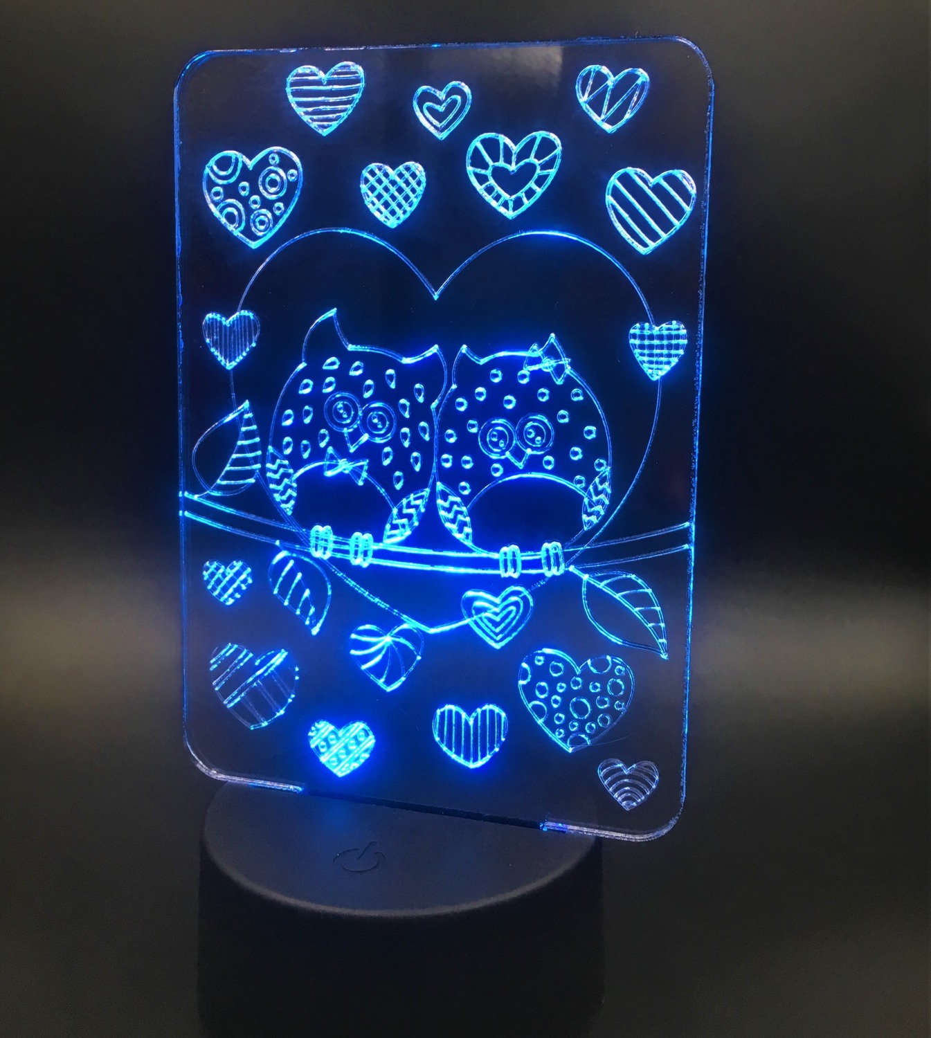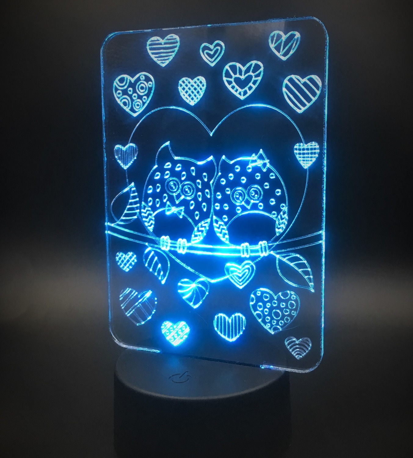 Night Lamp "Sovushki" It is made of acrylic 4 mm, the size of the visible part of the plate is 112 * 172 mm. Stand round shape with a diameter of 83 mm, height 40 mm. The power source is a battery or USB cable. Seven glow modes. The total height of the lamp 212 mm. The lamp - a night light will be a wonderful gift for adults and for children!