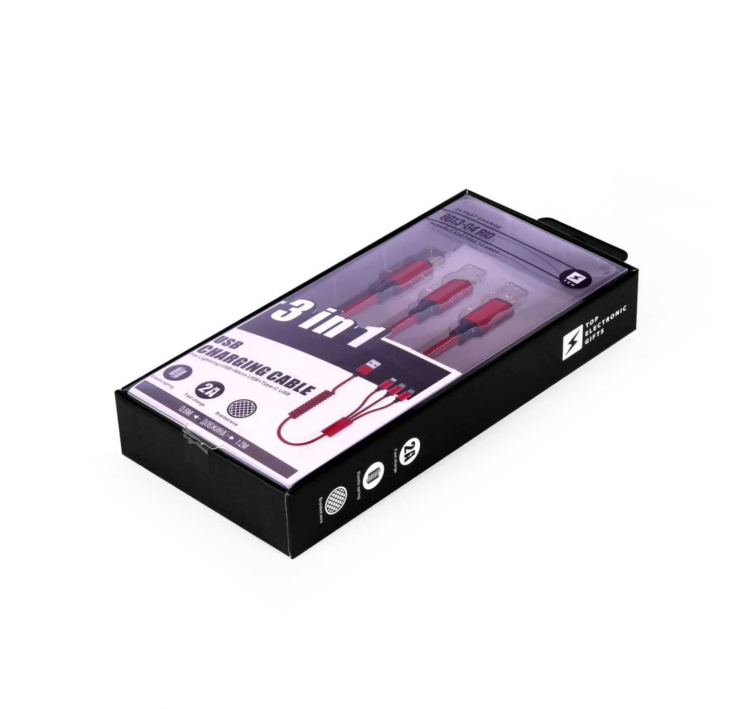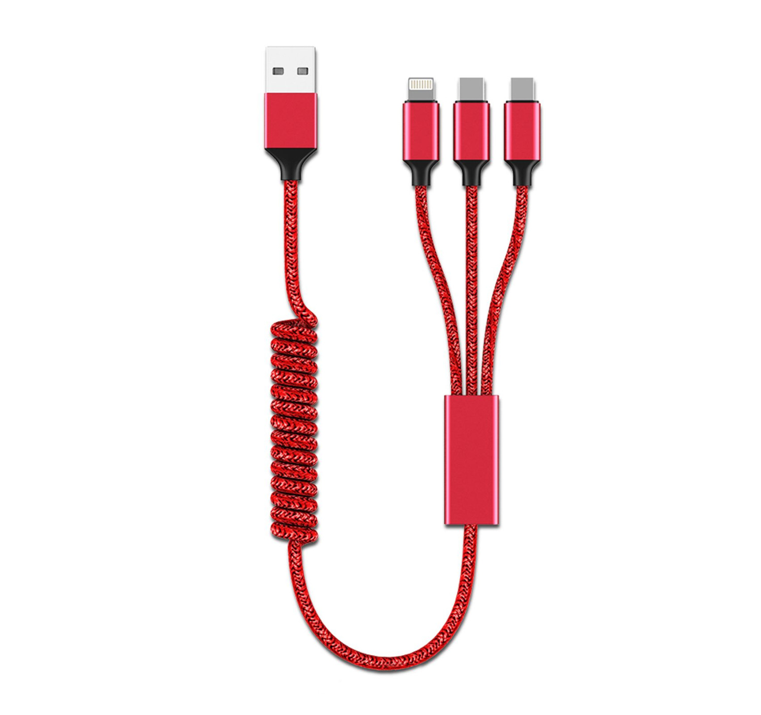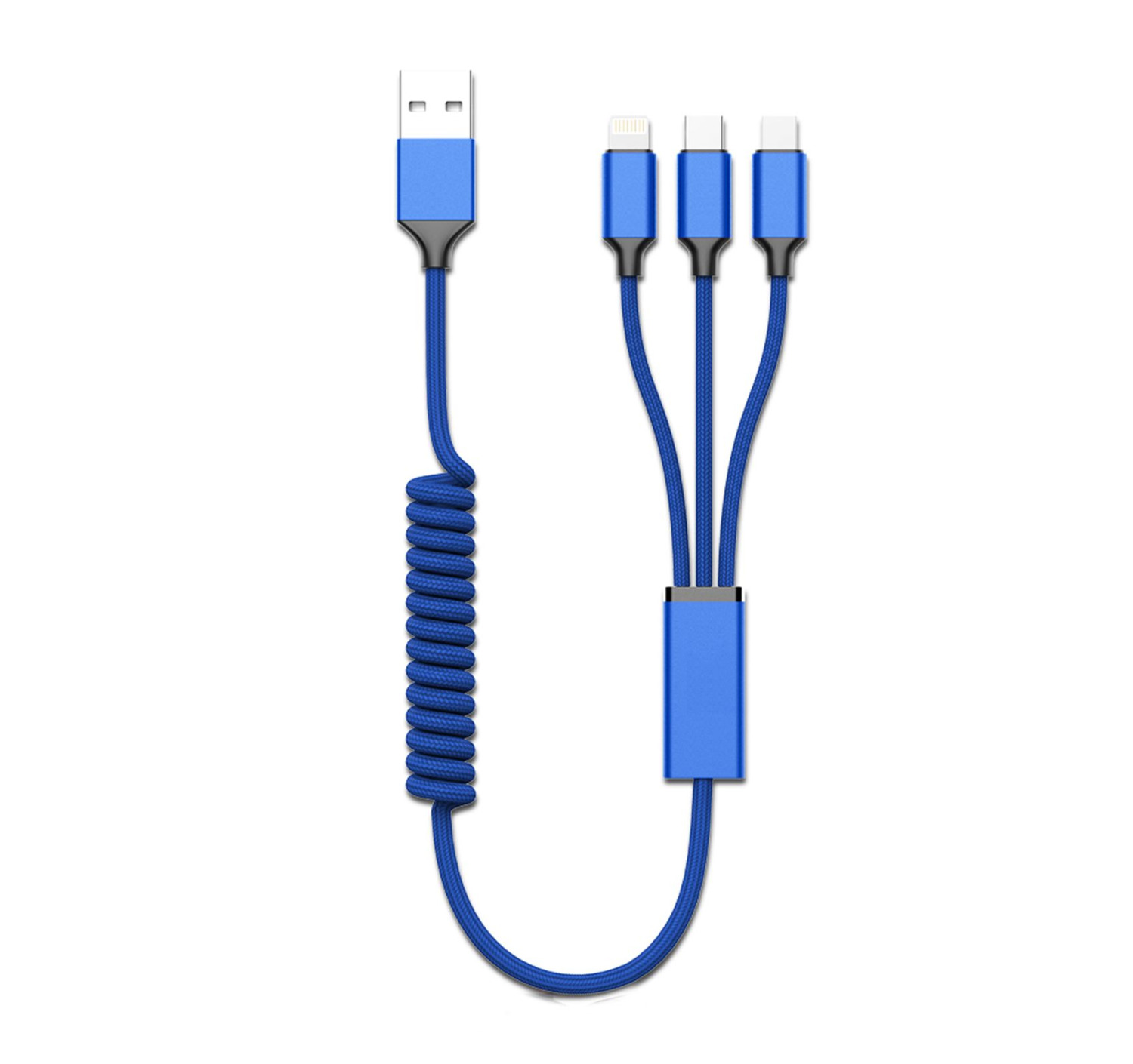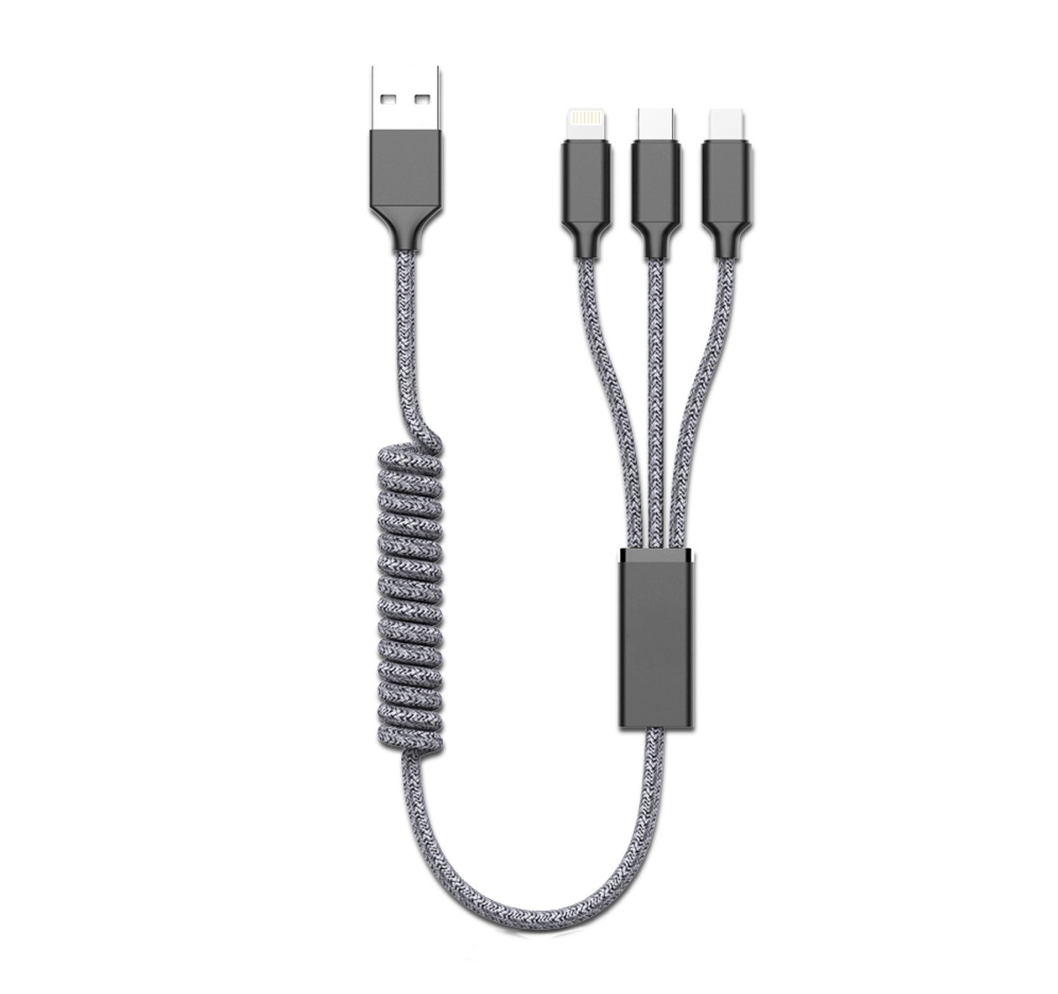 Universal 3-in-1 cable for charging gadgets, length in the extended state of 1.2 m. It has a standard USB input for connecting power and three different Lightning + Mscro USB + Type-C outputs.