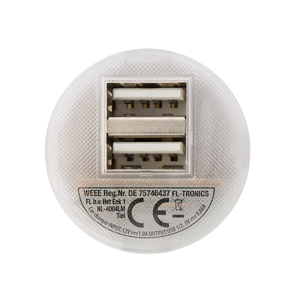 Пластиковий автомобільний адаптер живлення з двома портами USB 2.0 дозволить заряджати два пристрої одночасно. Підключається в прикурювач автомобіля.