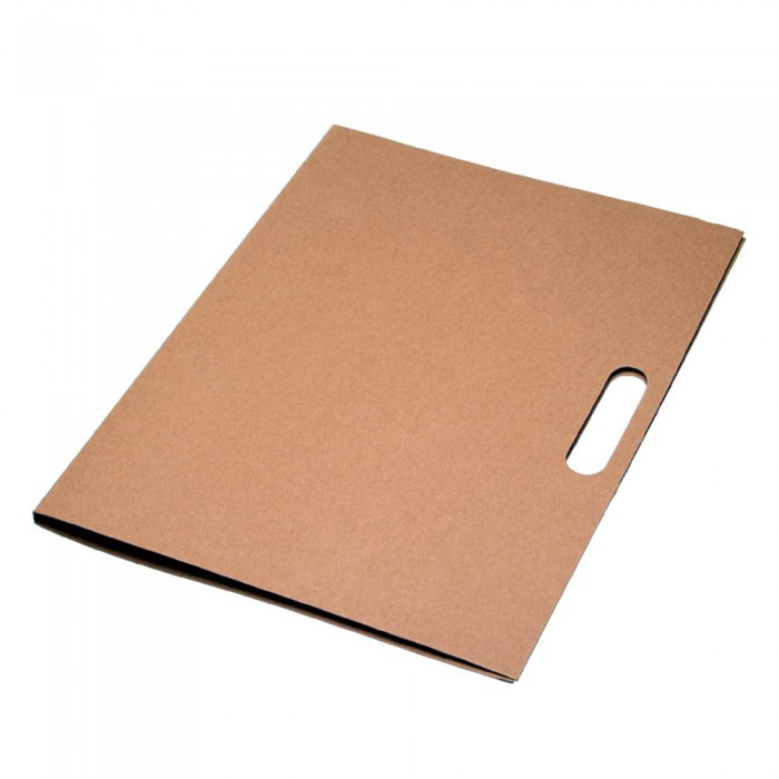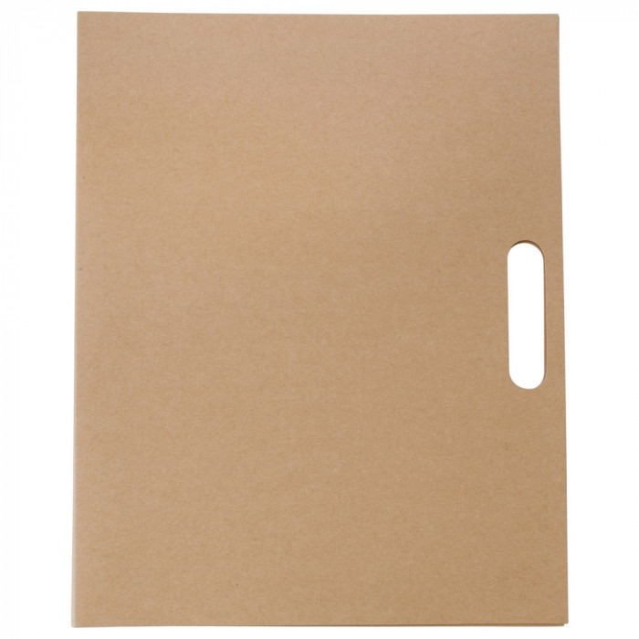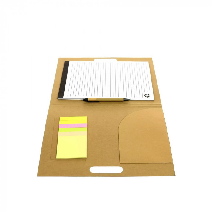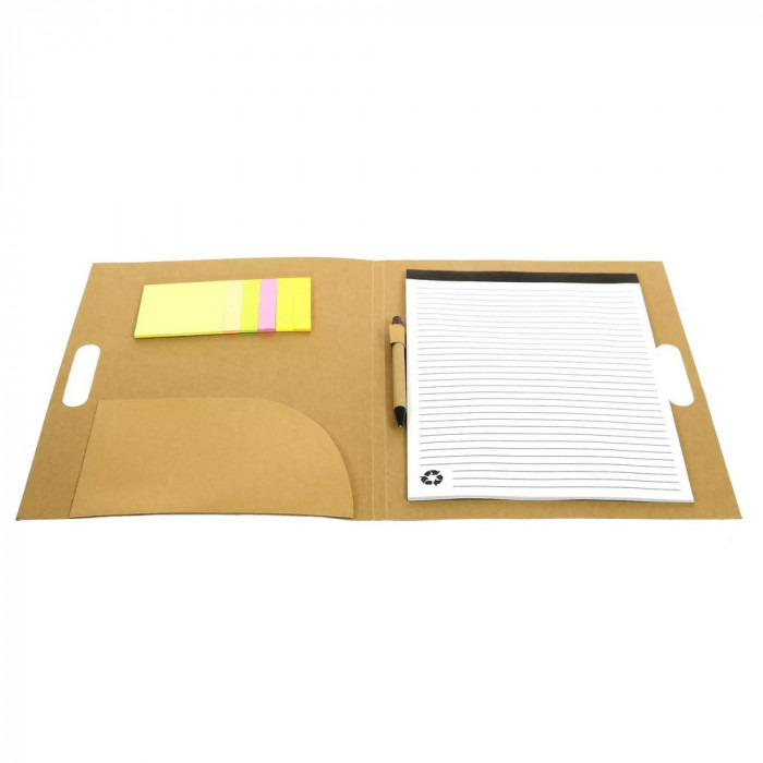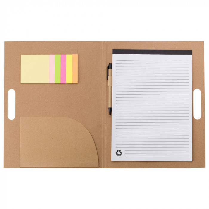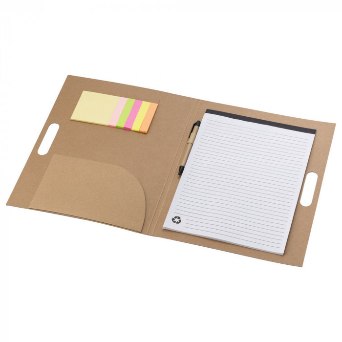 Папка із перероблених матеріалів. Містить FSC-сертифікований блокнот (25 аркушів у лінійку), кріплення для ручки, ручку з переробленого картону, комплект стікерів п'яти різних кольорів по 25 шт кожного кольору та спеціальне відділення для документів.