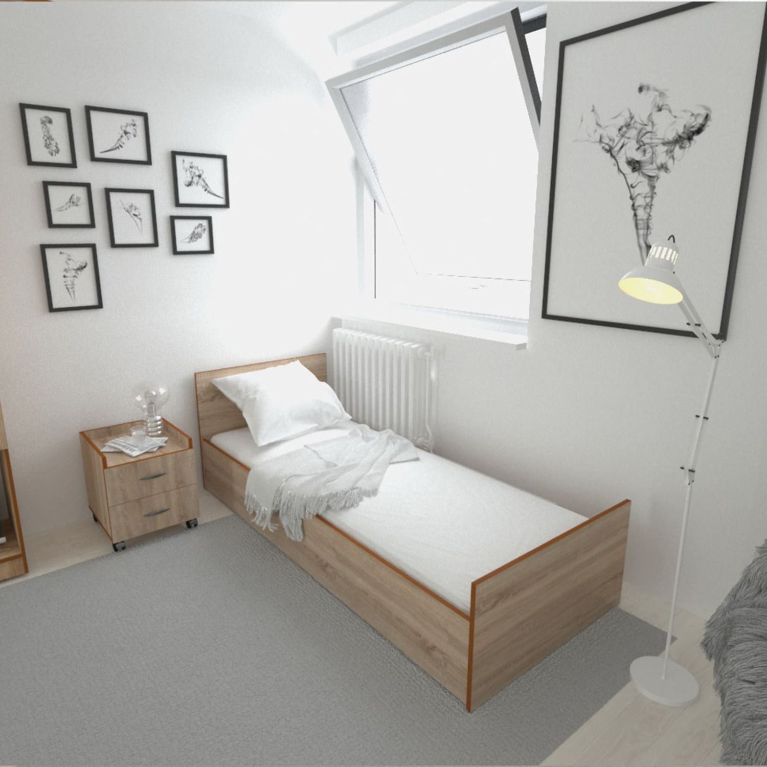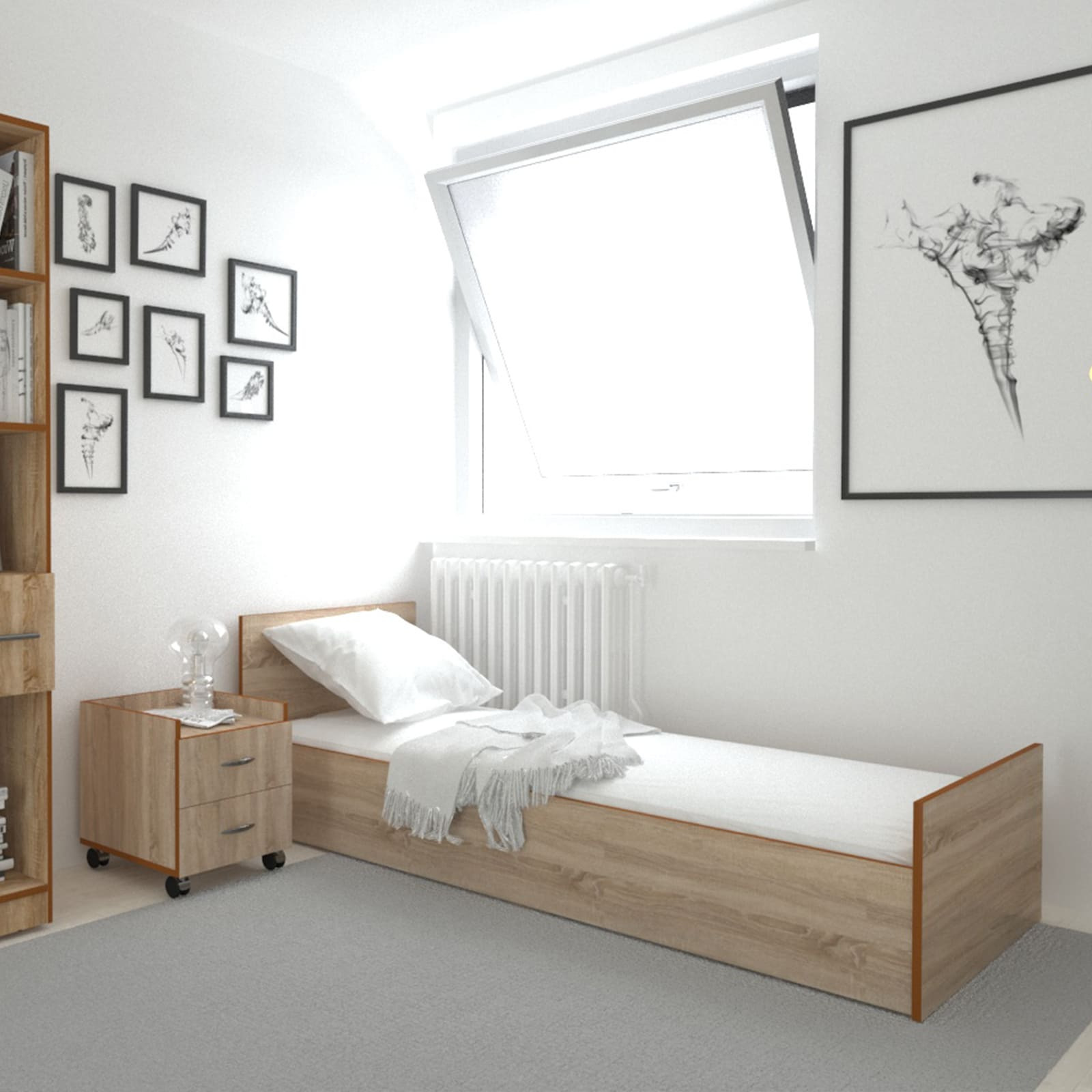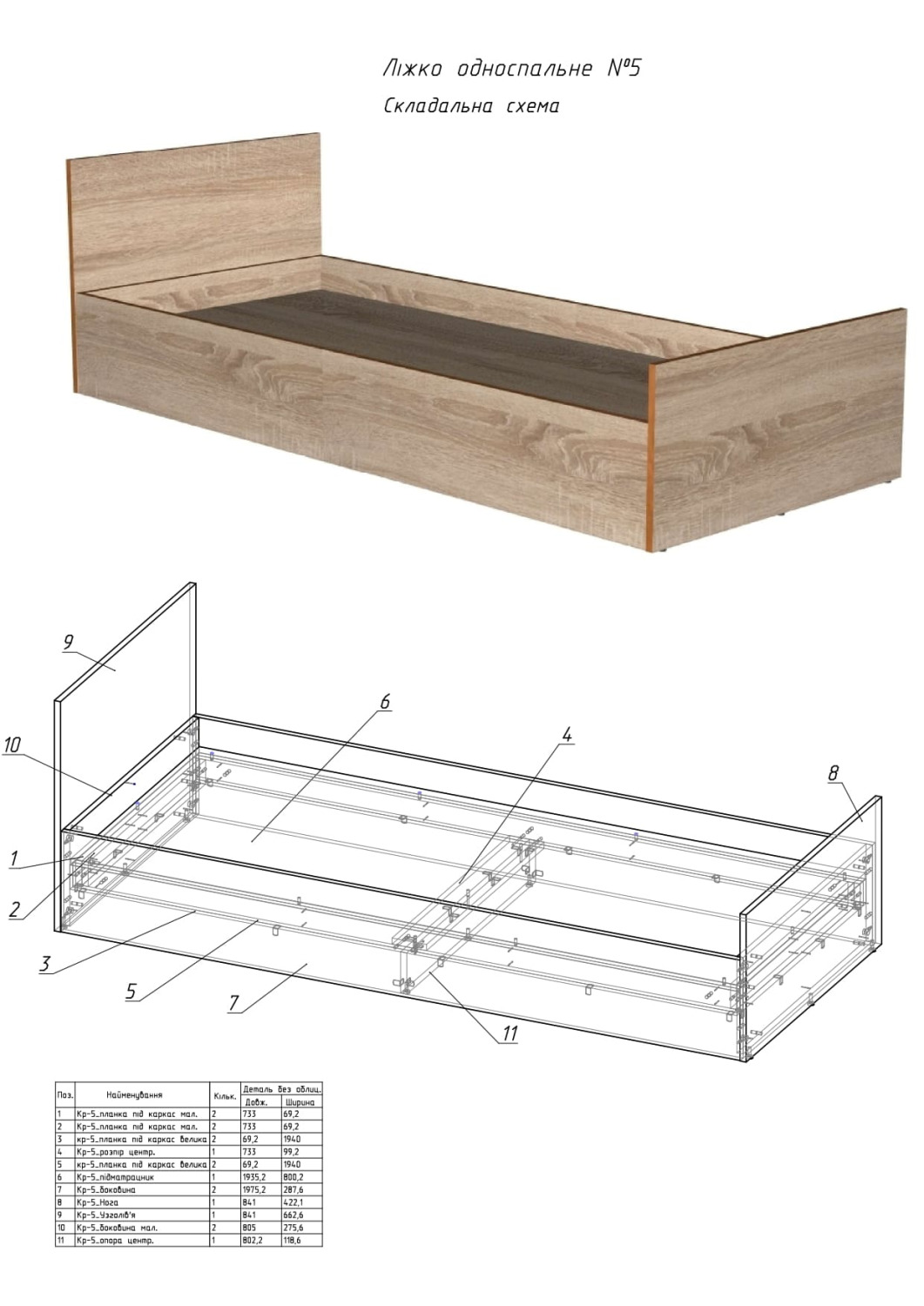 Ліжко (полуторне) без матраца виготовлене з ДСП Kronospan 18 мм, колір Дуб Сонома світлий (ви можете обрати колір будь-який), кромка 2 мм, з'єднання за допомогою конфірмантів, саморізів, ніжки меблеві, фурнітура на ваш вибір.
