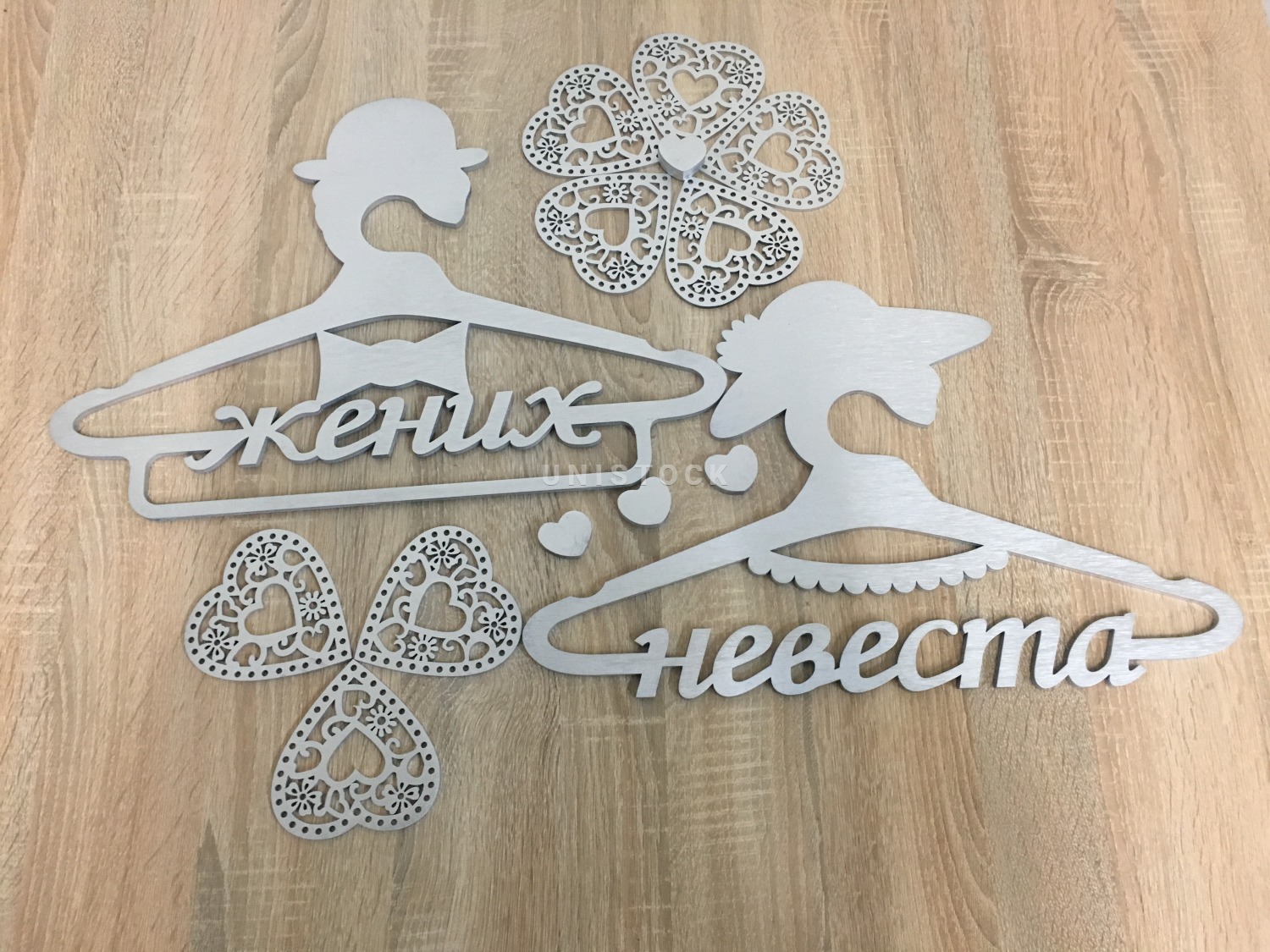 Весільні плечики "Наречений та наречена" - чудовий аксесуар для весільних фотосесій або відео, який передасть тепло одного з найщасливіших моментів вашого життя. Аксесуар використовують для фотографій та відео весільного костюма нареченого. Весільні вішалки можна замовити на українській та російській мовах, ажурні, використовувати різні шрифти. Матеріал - екологічно чистий, дерево.