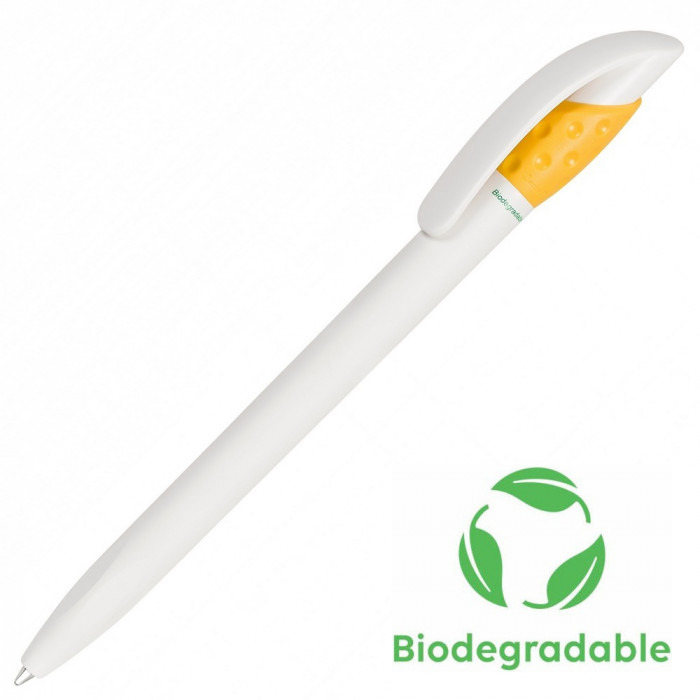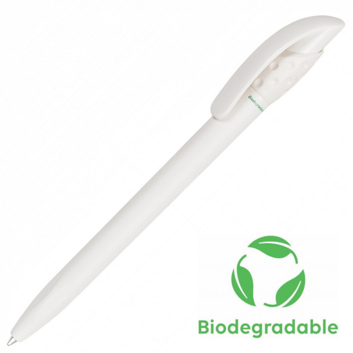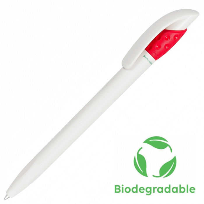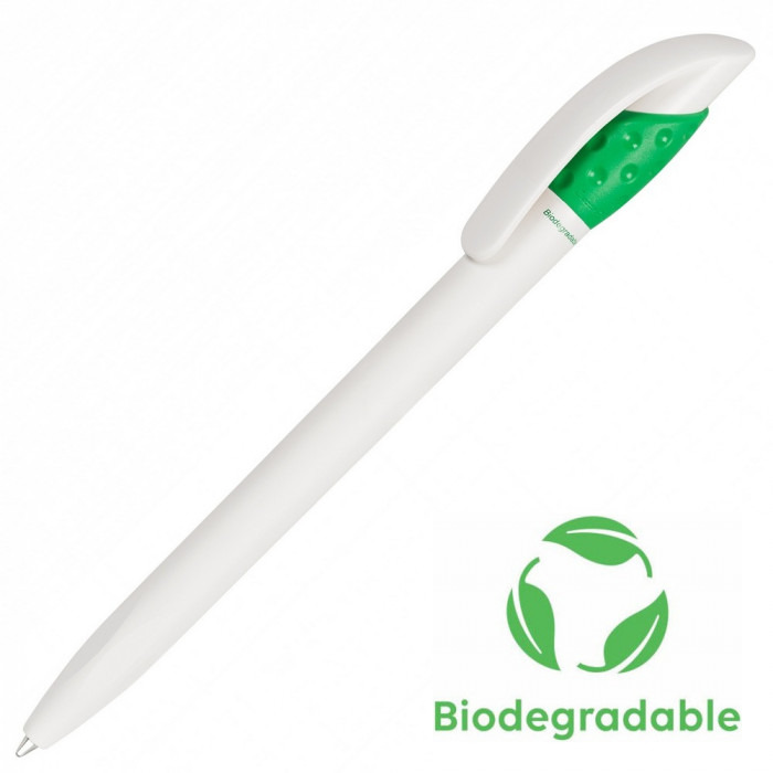 Кулькова еко-ручка виготовлена з біопластику, створеного на основі кукурудзяного крохмалю. На 100% біорозкладається, потрапляючи в ґрунт (за винятком стрижня та пружини). Оригінальна форма верхньої частини імітує м'яч для гольфу та створює неповторний легкий стиль. Тип стрижня: пластик X-20. Механізм – кнопковий.