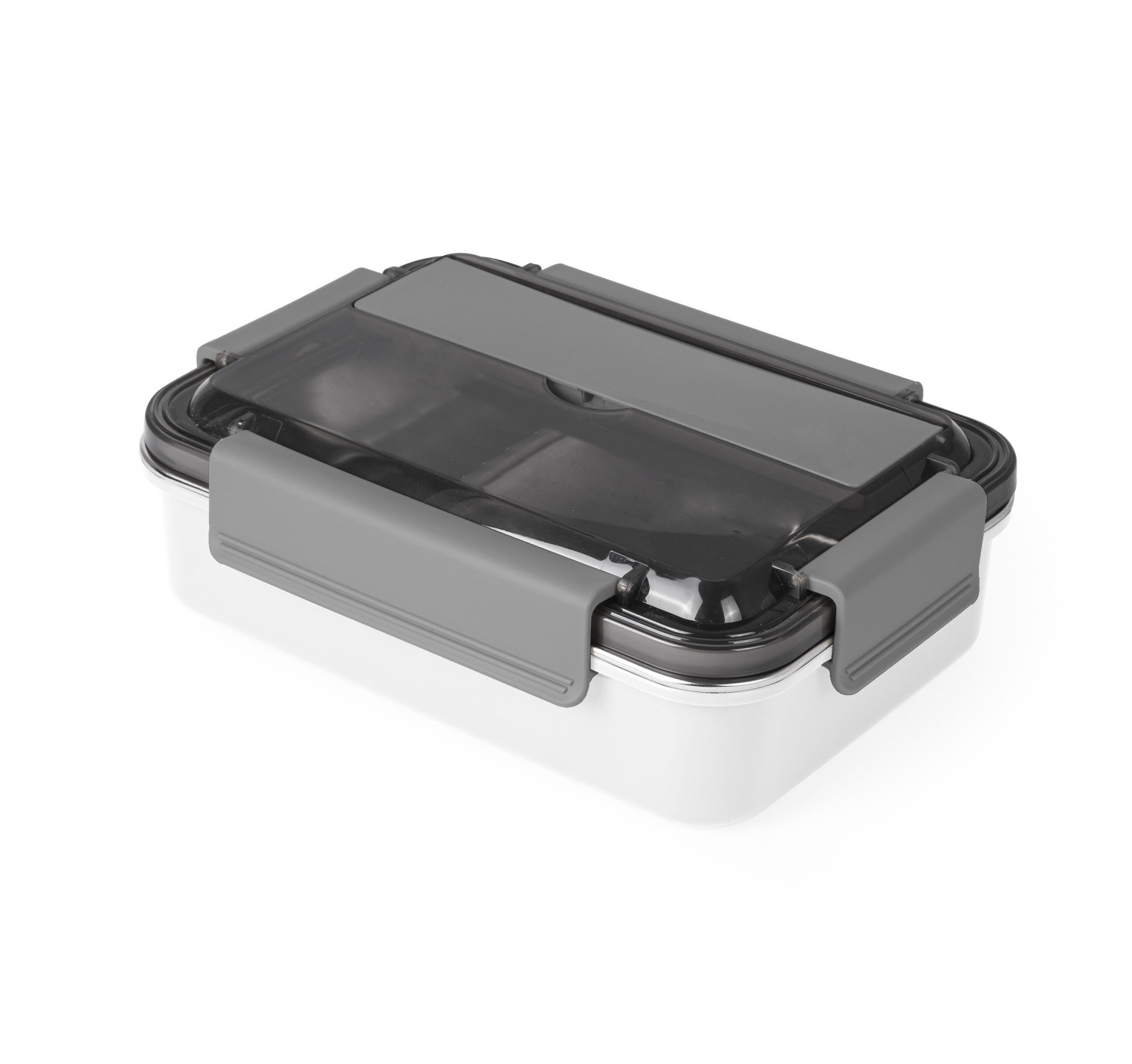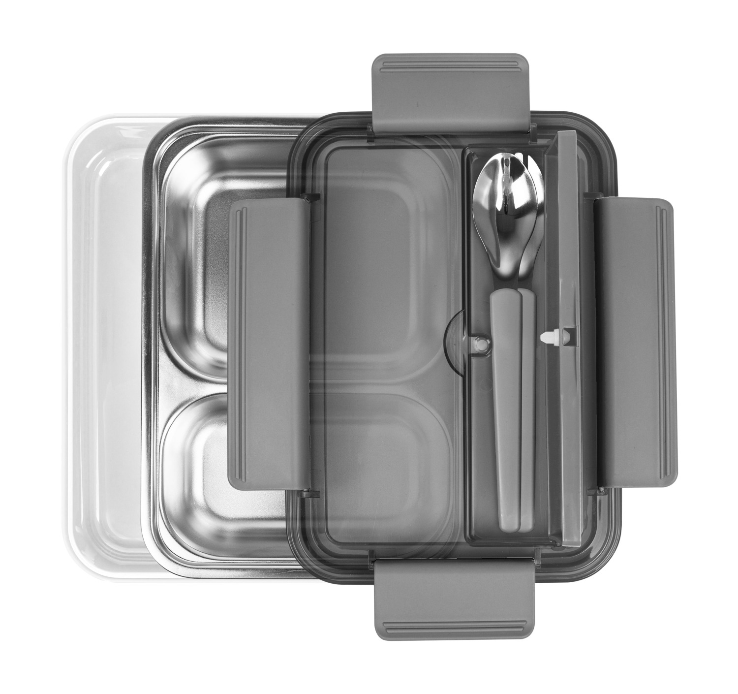 Має прозору кришку, яка герметично закривається з додатковим відділенням, де зберігається виделка+ложка (в комплекті металева ложка+виделка). Посудина на два відділення з високоякісної нержавіючої сталі 304 . Обьем 800 мл.