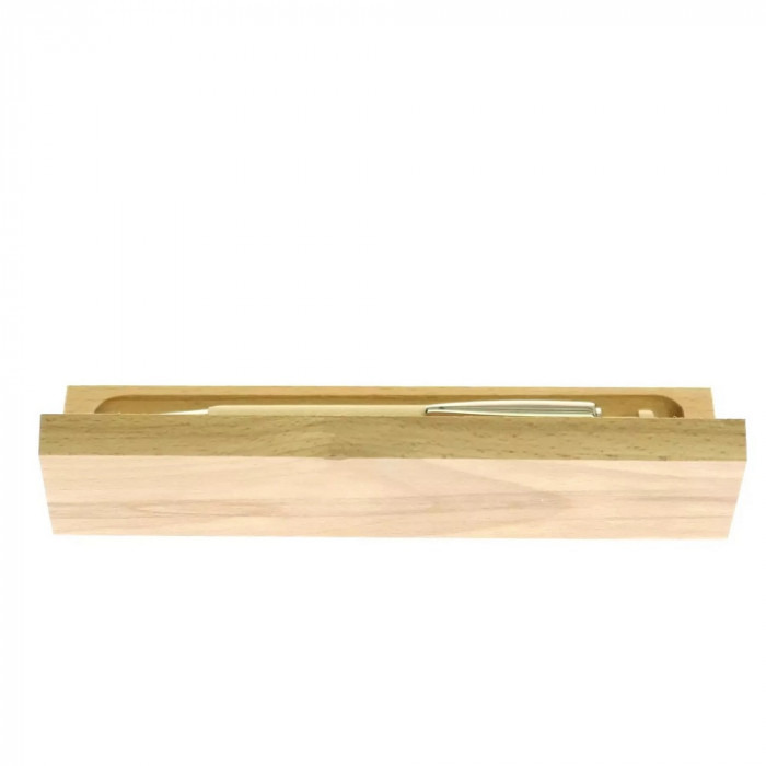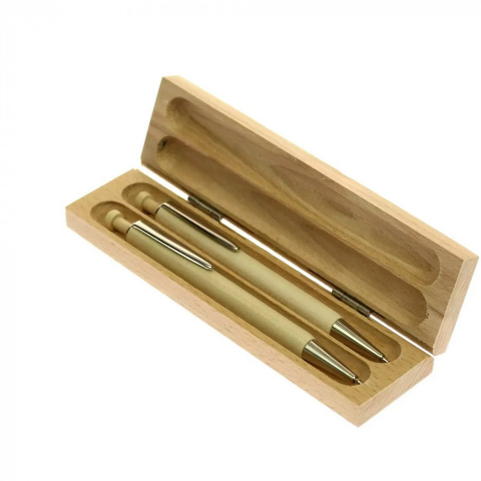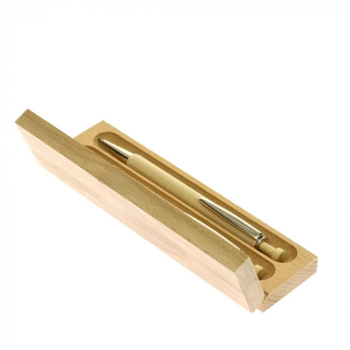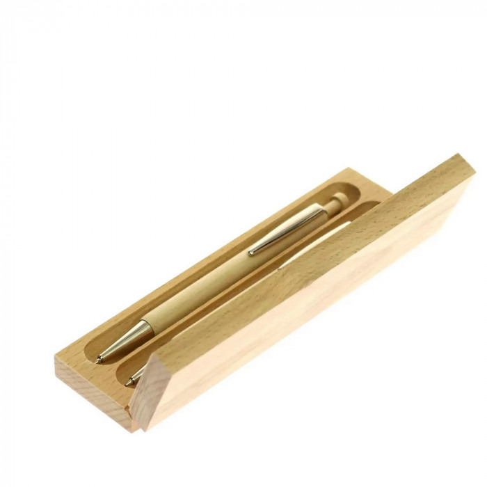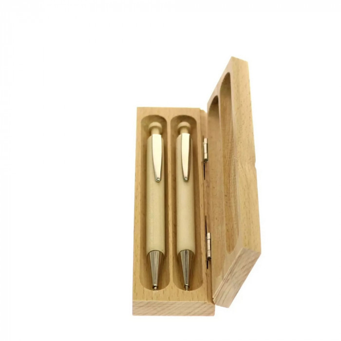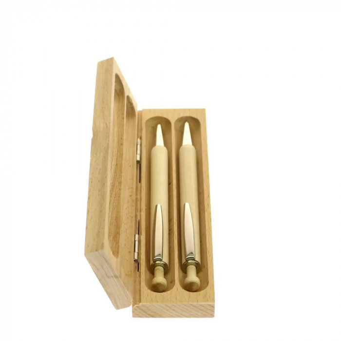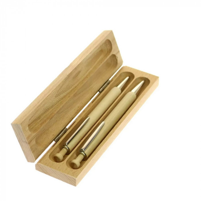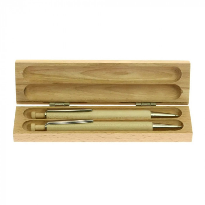 Письмовий набір із багаторазової кулькової ручки та механічного олівця. Ручка та олівець виготовлені з кленового дерева. Набір укомплектований у подарунковий футляр із бука. Матеріали: алюміній, бук, клен. Механізм – кнопковий.