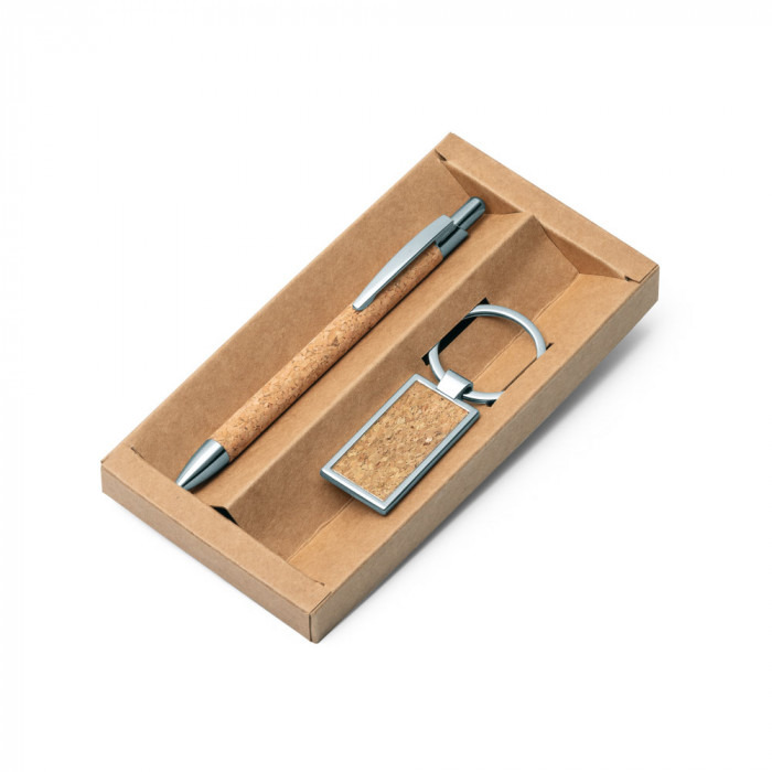 Набір кулькової ручки та брелока з металу з кірковим покриттям. Поставляється у подарунковій упаковці з крафт-паперу. Механізм – кнопковий.