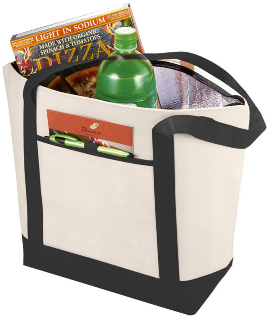 Неткана сумка-холодильник Lighthouse. Основне відділення на блискавці з подвійними ручками, висота ручок 23,5 см. Відкрита передня кишеня з тримачем для ручки. Аксесуари не увімкнені. Нітканий поліпропілен 80 г/м².