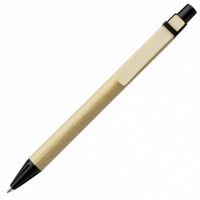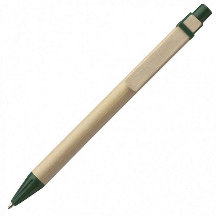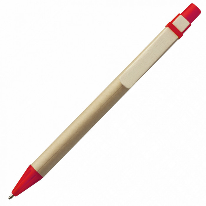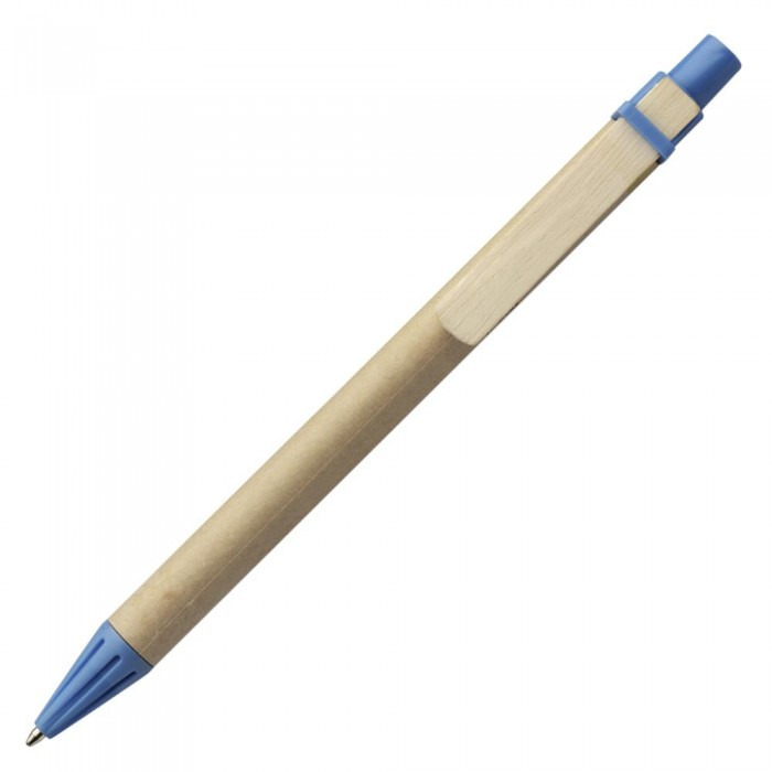 Одноразова кулькова ручка з переробленого картону із кольоровими пластиковими елементами. Матеріали: ABS-пластик, картон. Механізм – кнопковий.