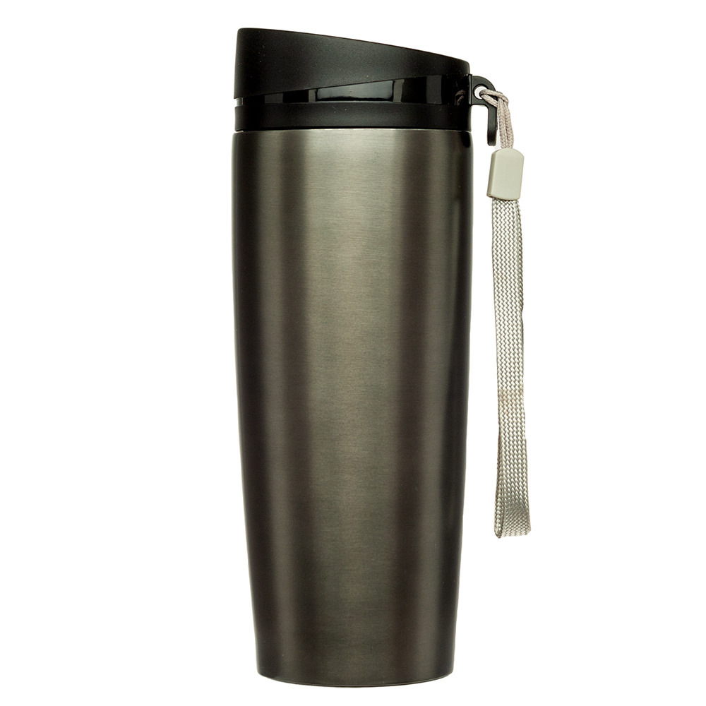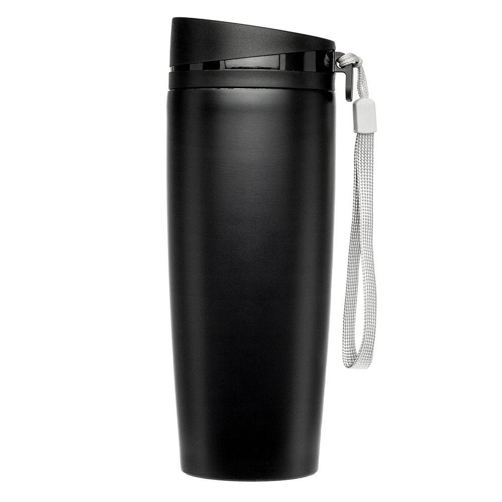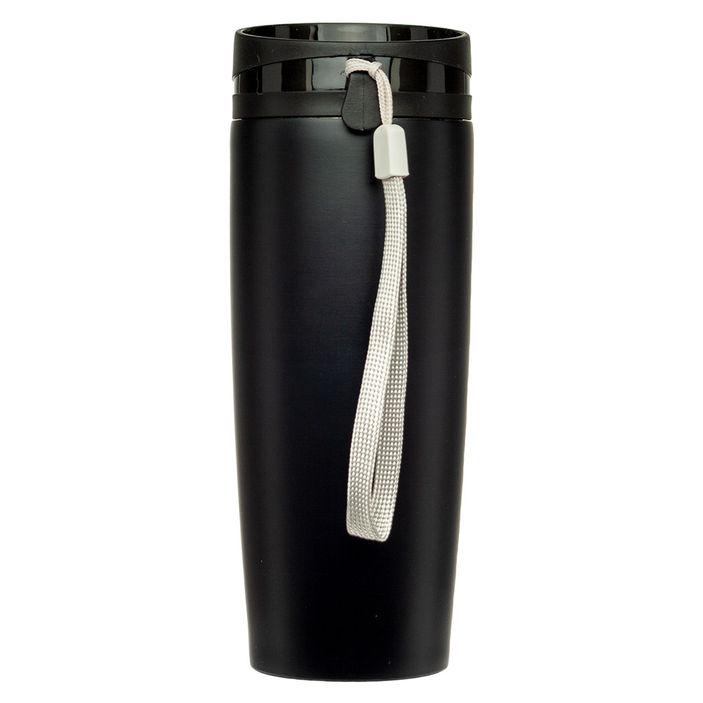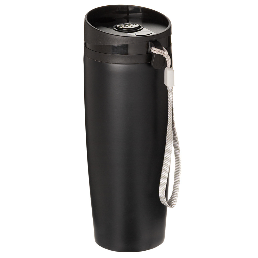 Надійна пластикова кришка з кнопкою OPEN / CLOSE і отвором для пиття, і ремінець на руку.