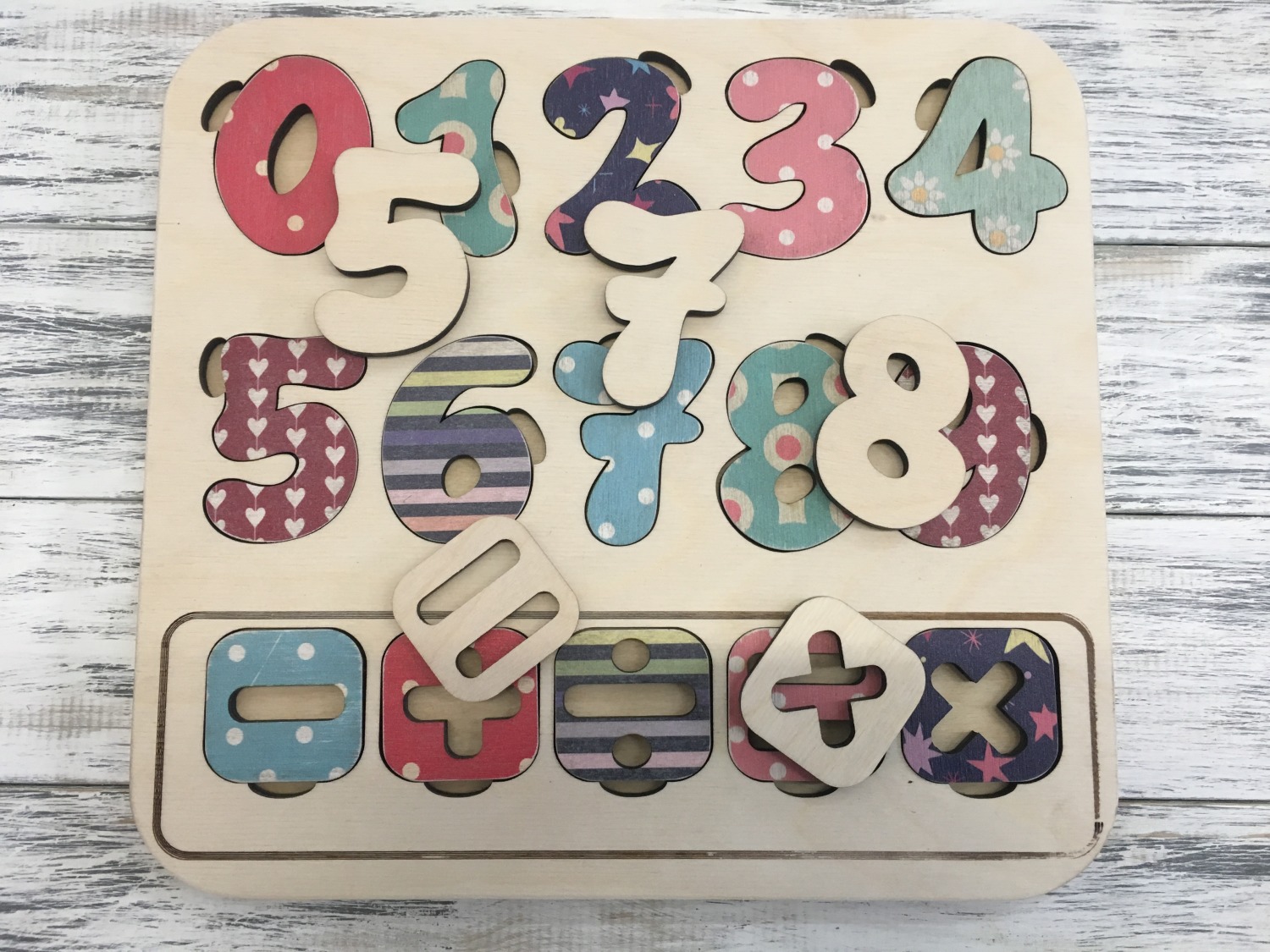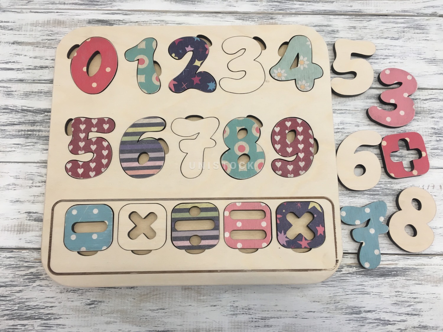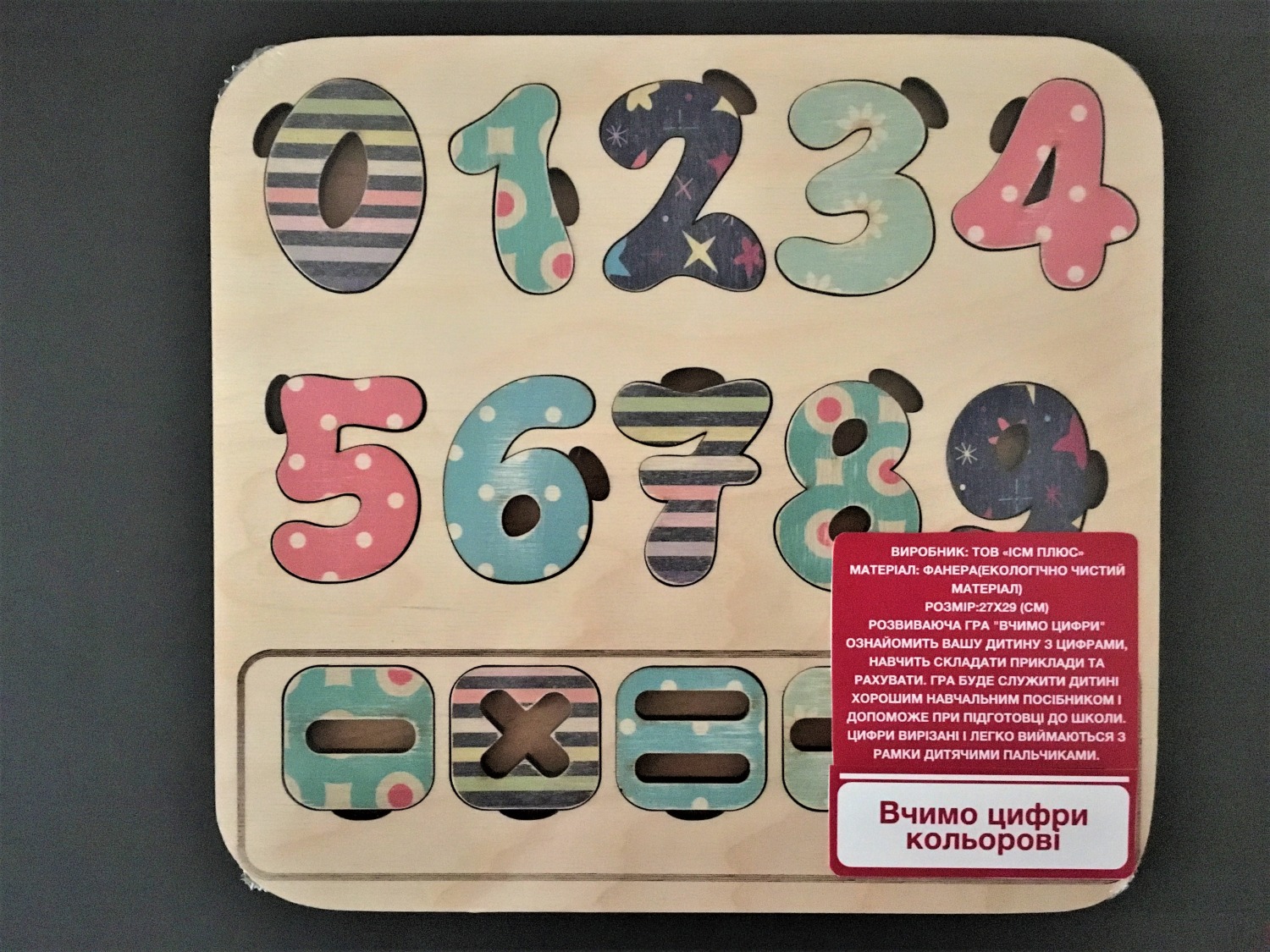 Розвиваюча гра "Вчимо цифри" ознайомить вашу дитину з цифрами, навчить складати приклади та рахувати. Гра буде служити дитині хорошим навчальним посібником і допоможе при підготовці до школи та навчанню в першому класі. Цифри вирізані і легко виймаються з рамки дитячими пальчиками, завдяки отворам . Екологічно чистий матеріал - дерево.