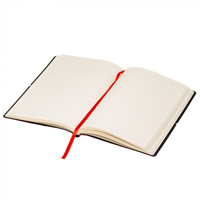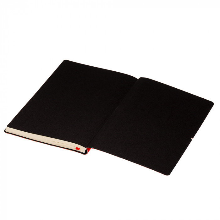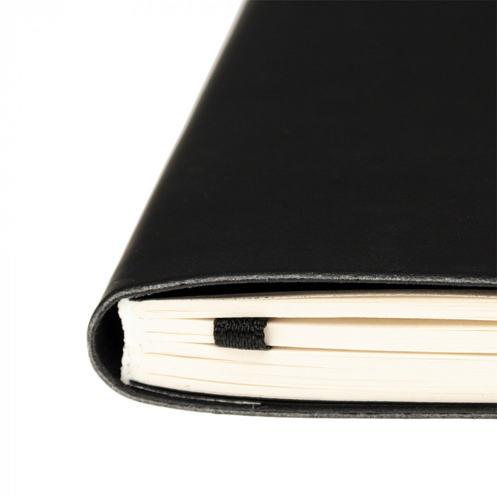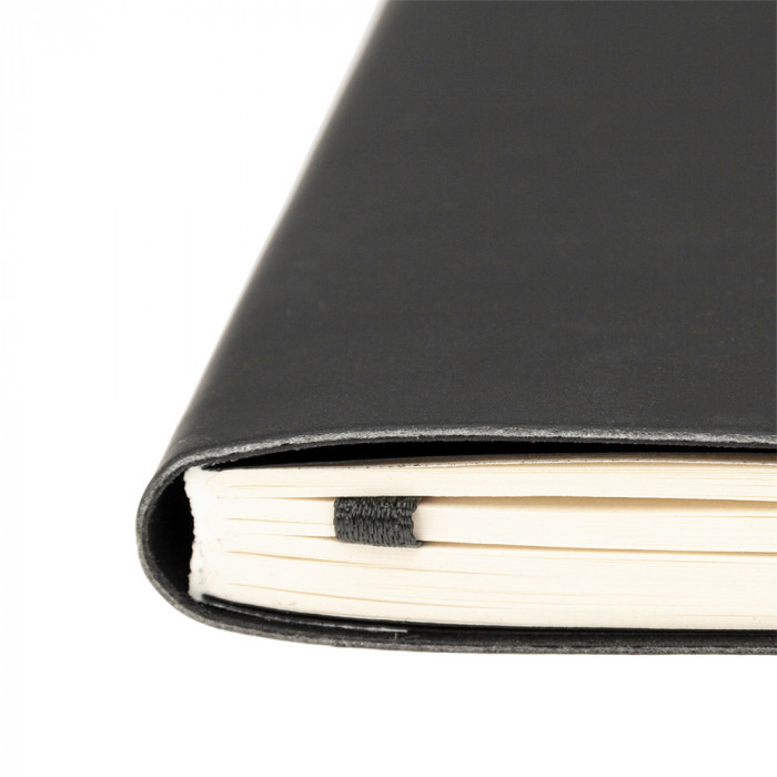 Велика область для внесення нотаток, ескізів та проектів. Зручний та практичний подарунок. Матова обкладинка має резинку-фіксатор, що перетягує блокнот посередині. Форзаци – чорного кольору. На кожній сторінці є місце для внесення дати.
