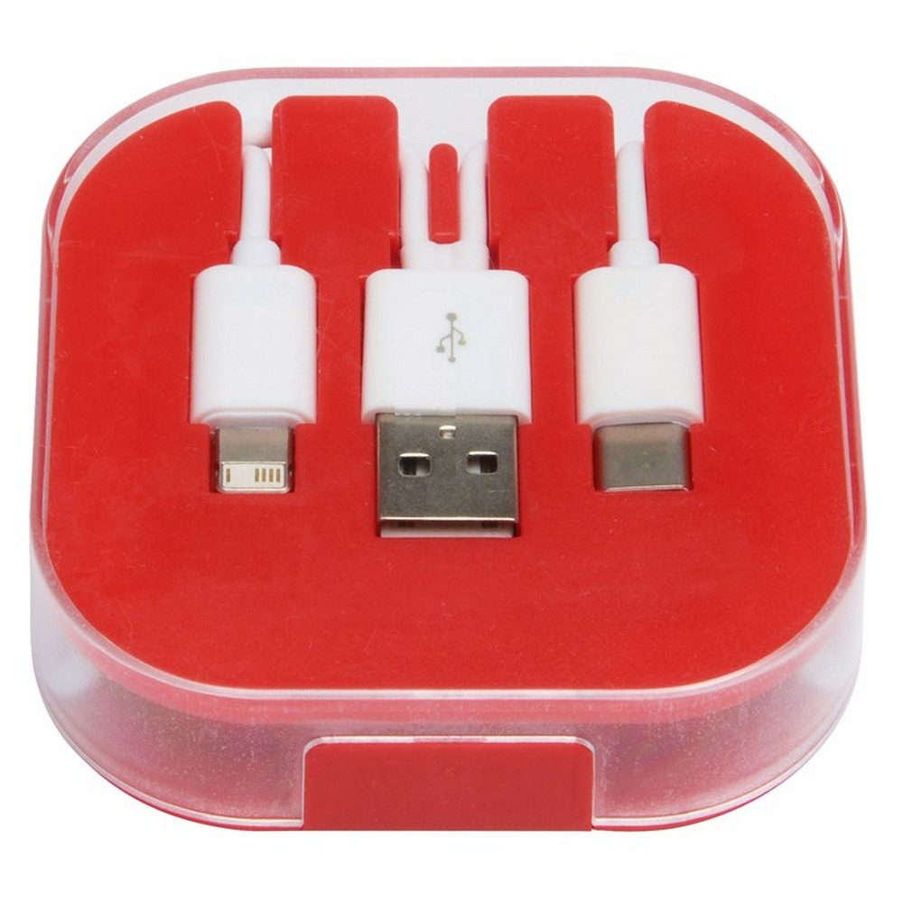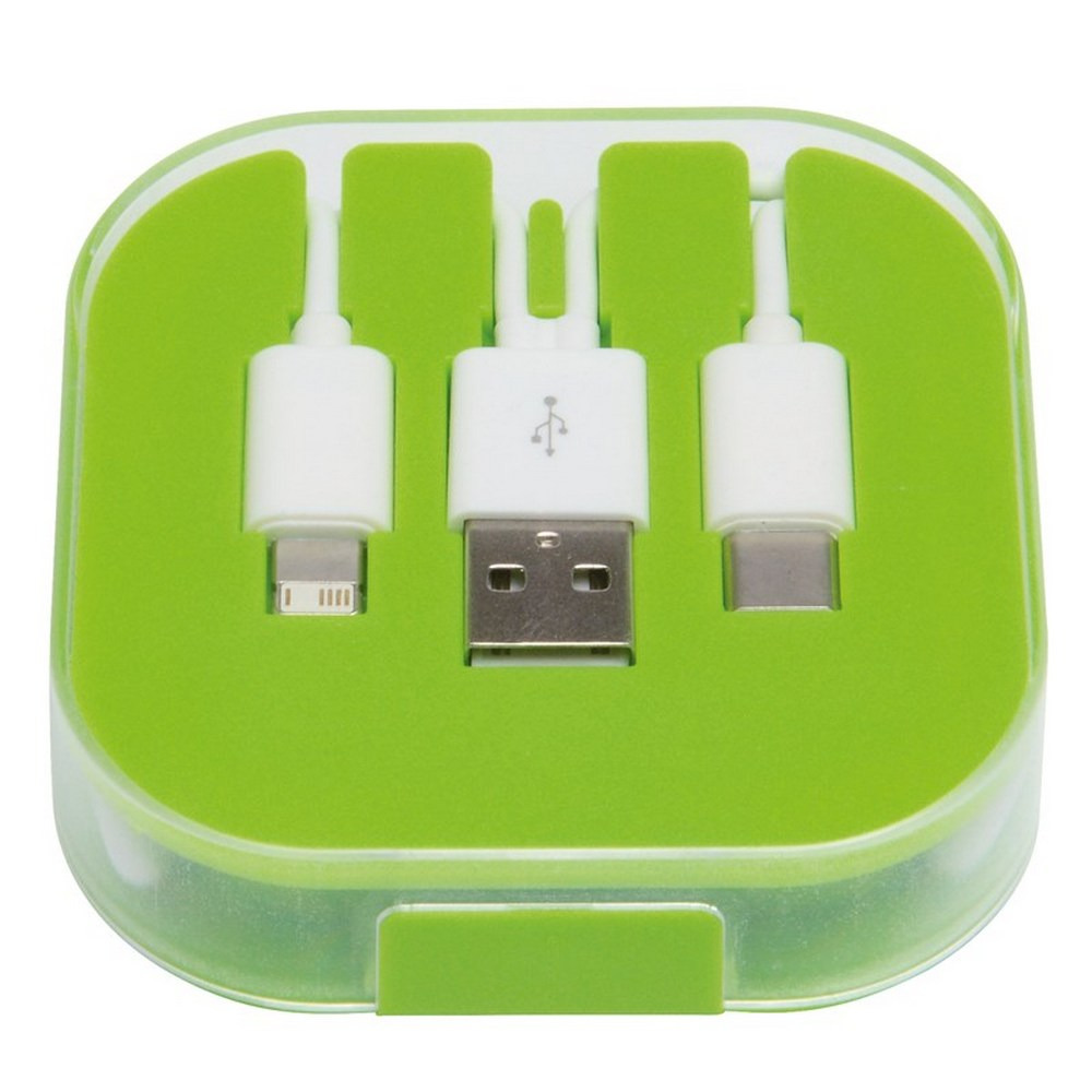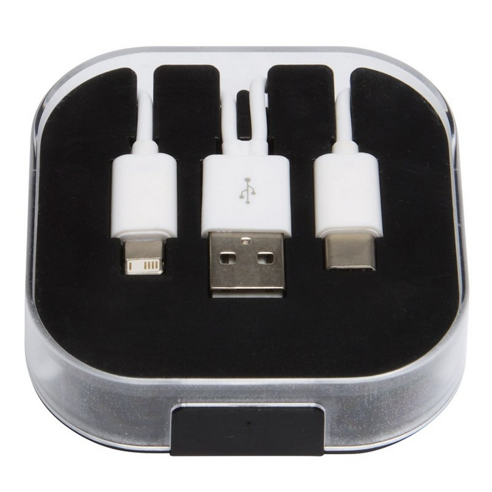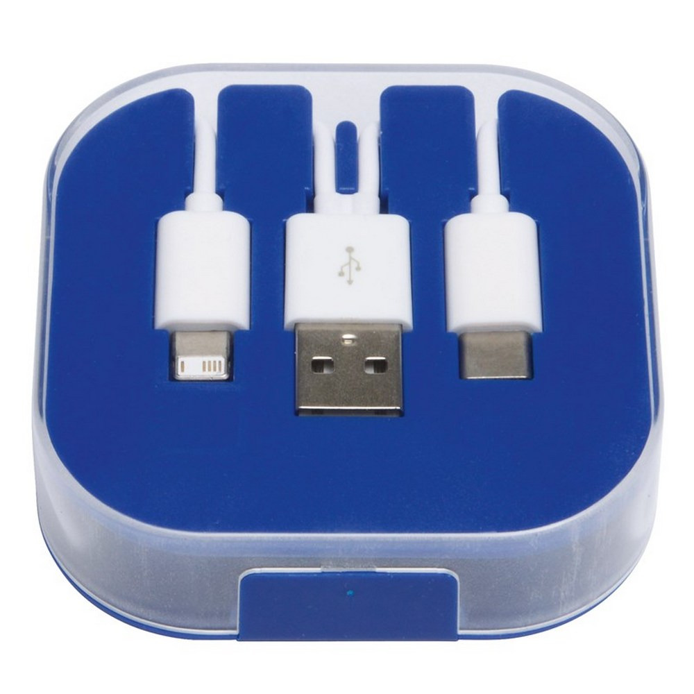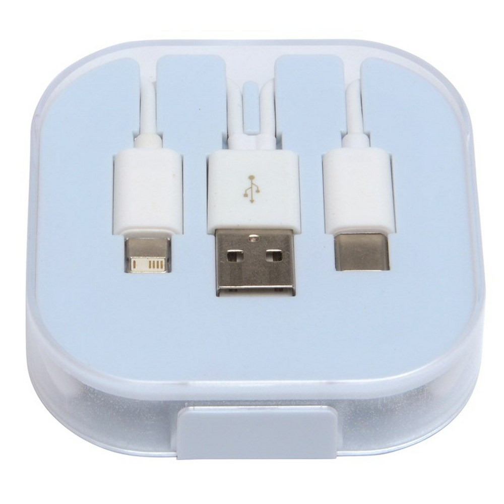 Зарядний кабель 3-в-1 для заряджання електронних пристроїв. Містить роз'єми USB, USB Type-C та micro-USB/5-pin Lightning. Підійде для гаджетів від Apple із 5-pin Lightning роз'ємом. Поставляється у кольоровому пластиковому футлярі для зберігання, що містить висувну підставку для смартфона.