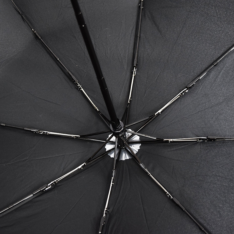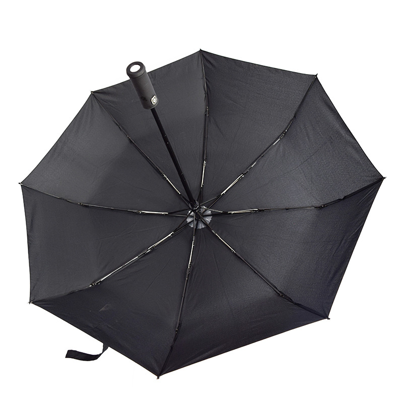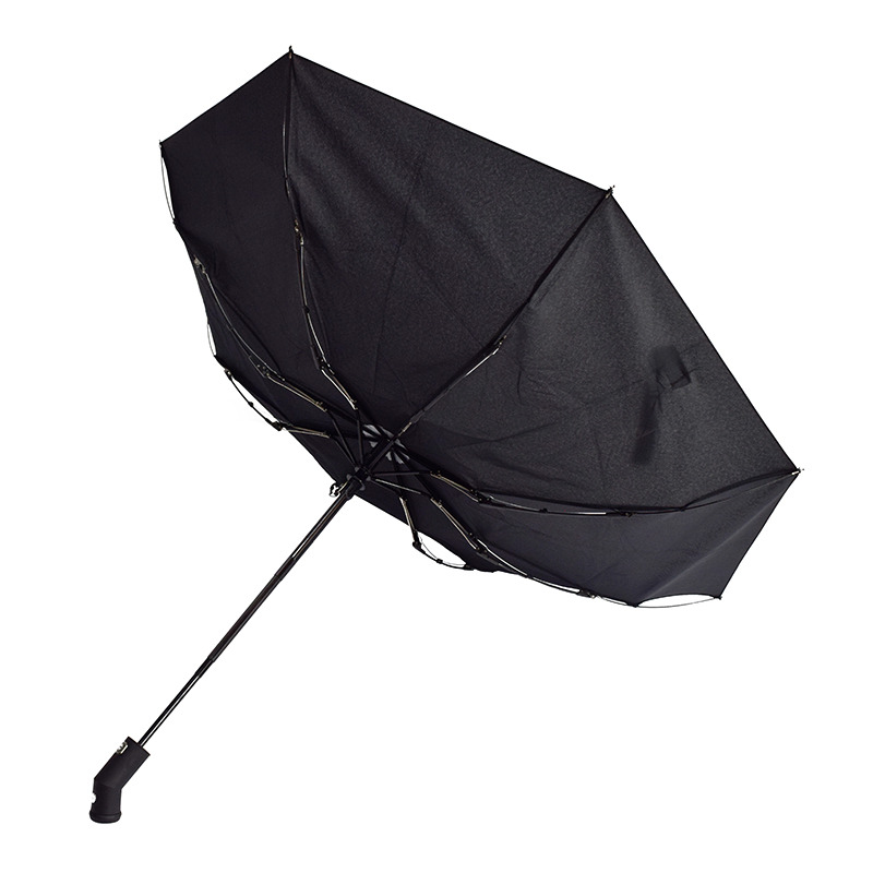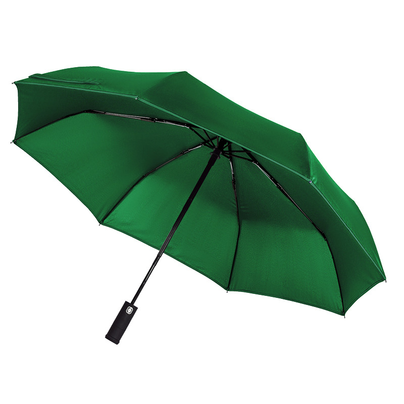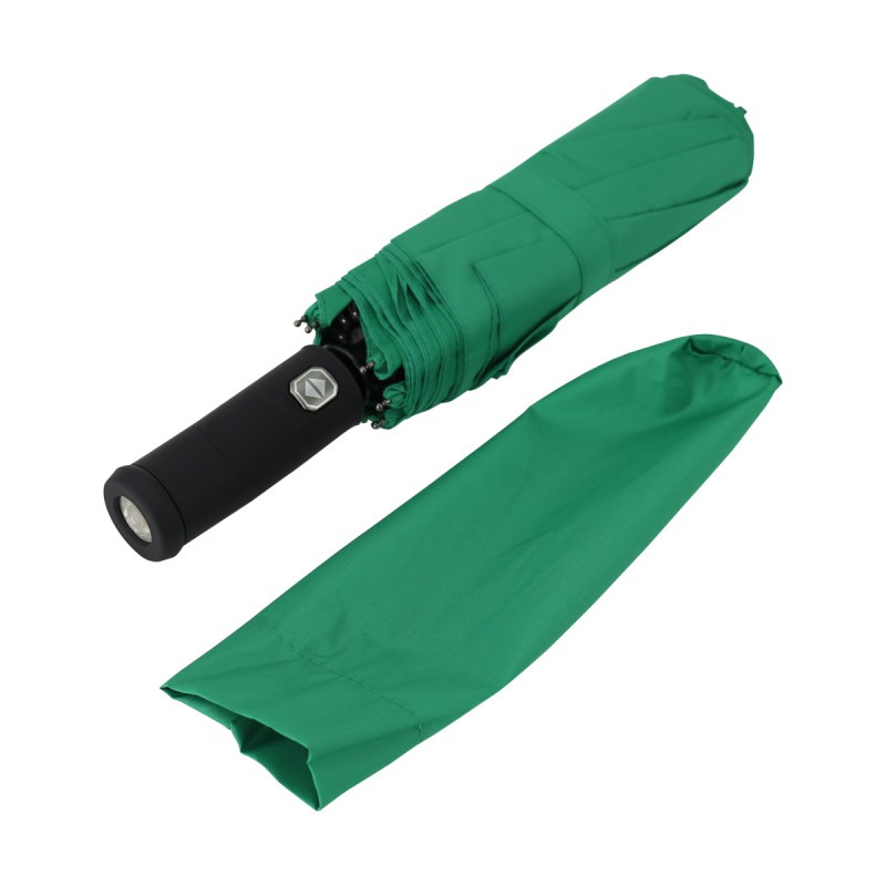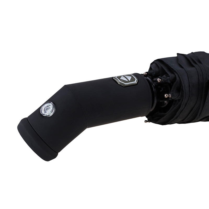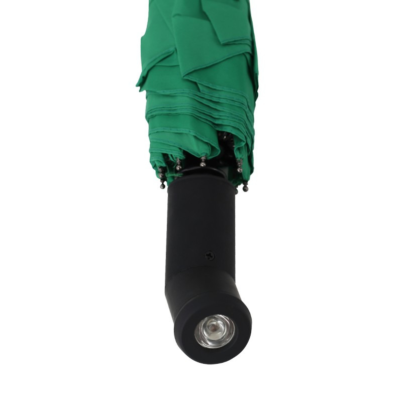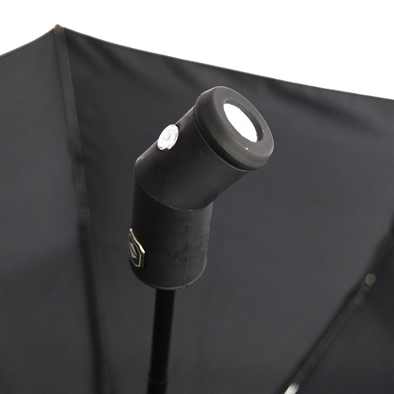 Автоматична парасолька LIGHT з ліхтариком і системою антишторм. Ліхтар розташований знизу ручки. Головною технічною родзинкою ліхтаря є наявність рухомого механізму, який дозволяє змінювати кут освітлення - всього вісім положень. Для роботи ліхтаря знадобляться кнопкові батарейки. Купол парасольки виготовлений з матеріалу епонж - тканина з суміші поліестеру та бавовни. Такий матеріал володіє високими водовідштовхувальними властивостями. Вода на ній збирається в краплі і стікає залишаючи поверхню практично сухою, тканина швидко сохне. Ручка: пластик, покриття soft-touch Металевий стрижень. Спиці: метал.